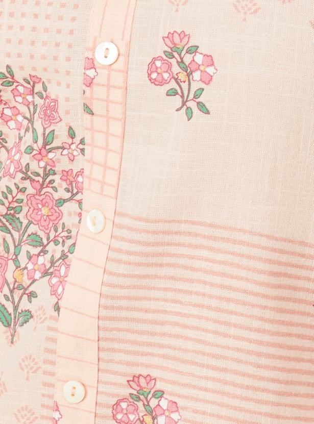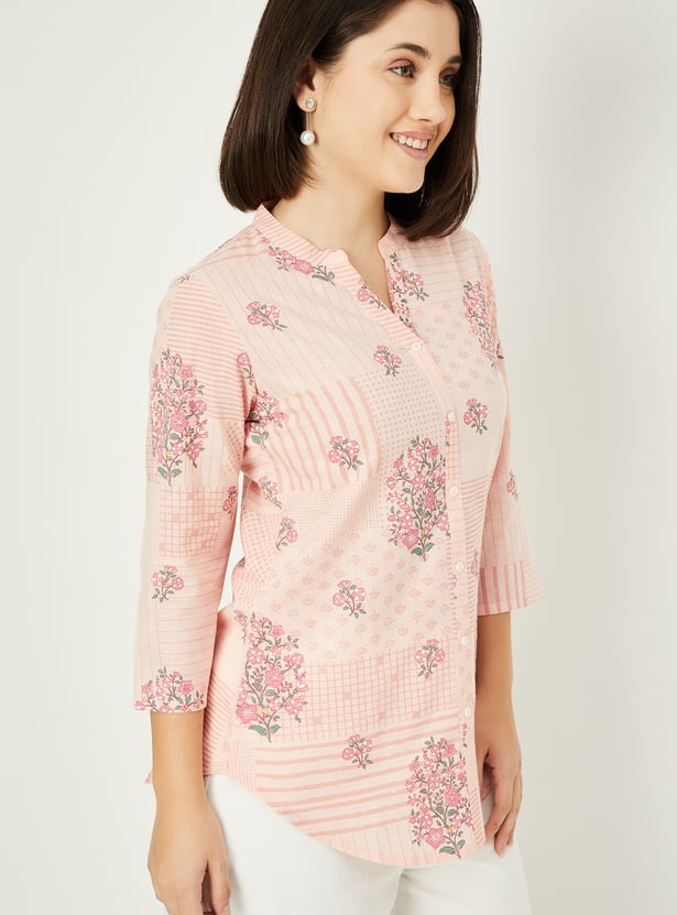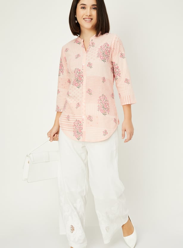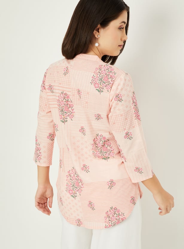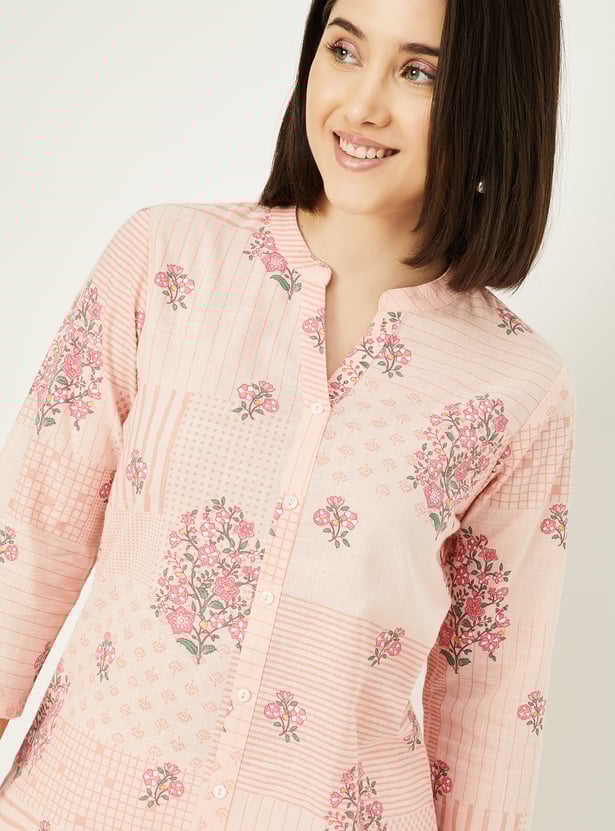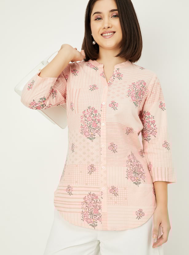 This floral print kurti brings a fresh, feminine charm with its vibrant pattern, band collar, and 3/4th sleeves. The breezy silhouette makes it perfect for both everyday wear and festive occasions.
