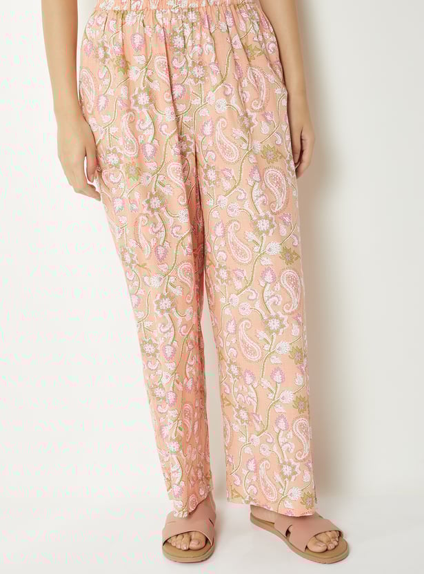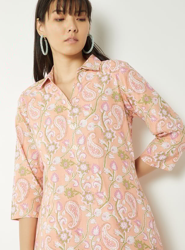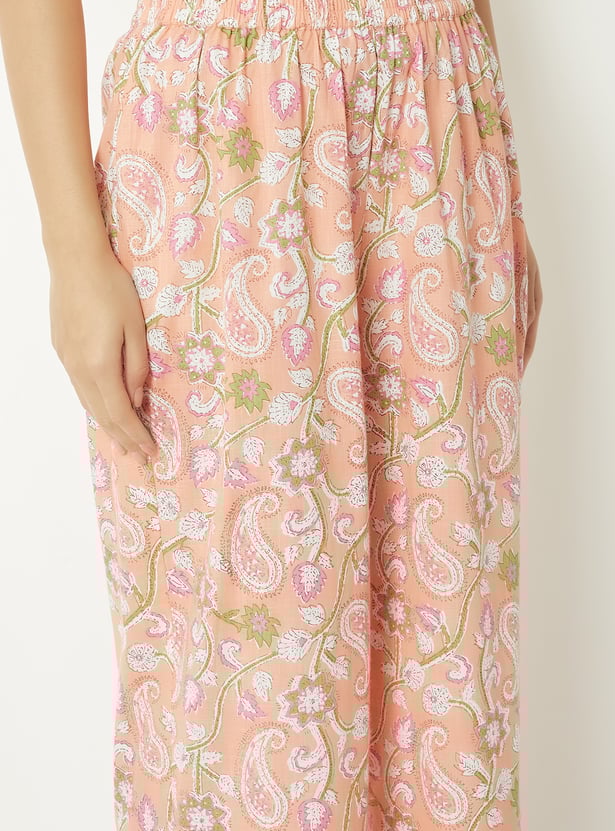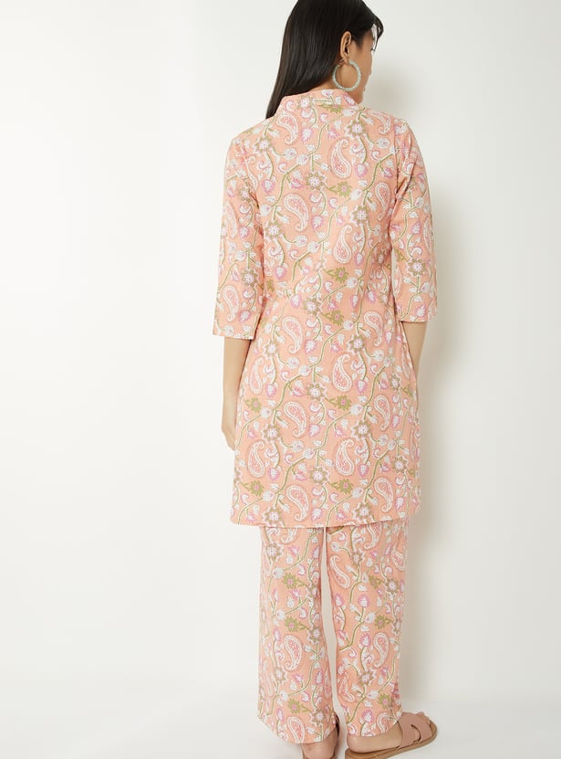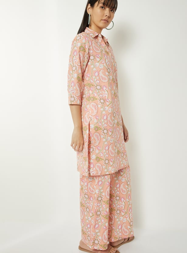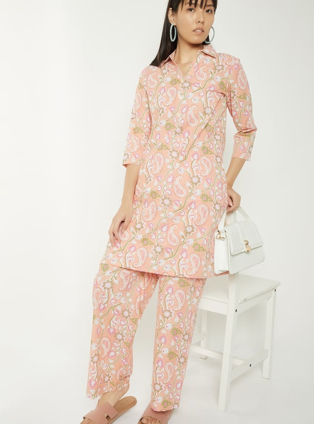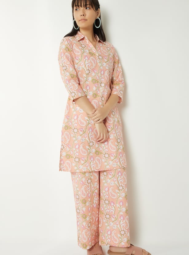 Step into effortless elegance with this floral-print palazzo set. The kurta features a stylish spread collar, 3/4 sleeves, and side slits for easy movement, paired with flowy palazzos designed with an elasticated waist and side pocket for all-day comfort.