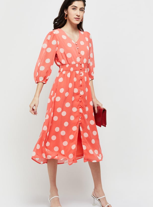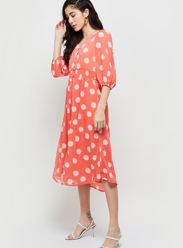 Slay the casual collection with this polka dots printed A-line dress. It flaunts a v-neck, three-quarter sleeves, and a midi silhouette. Team it up with a pair of chic heels to make a statement.