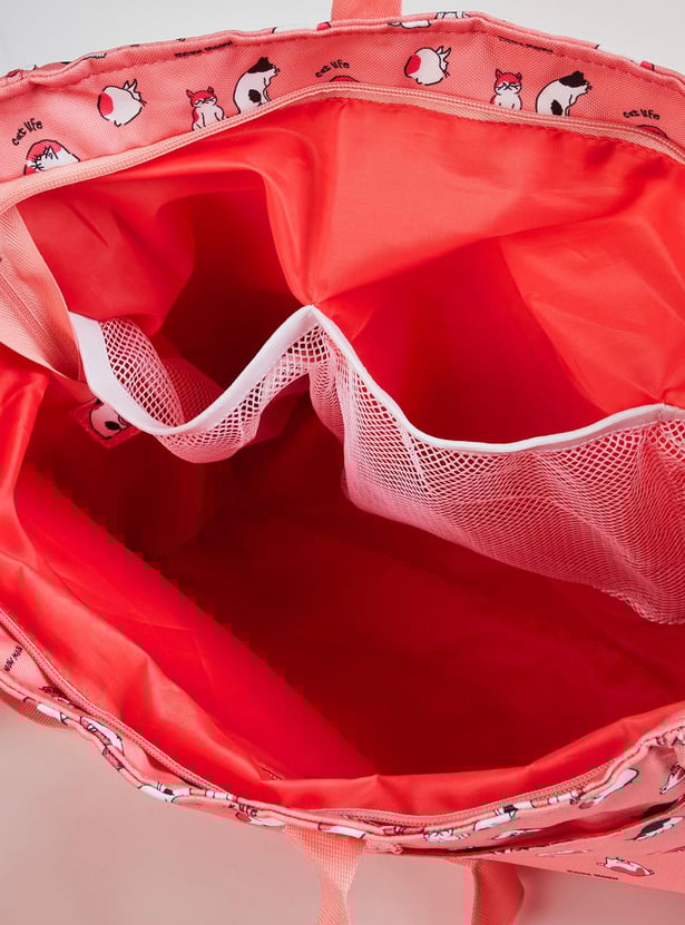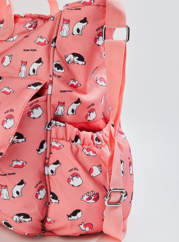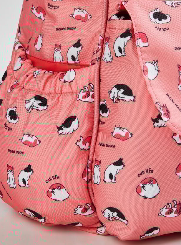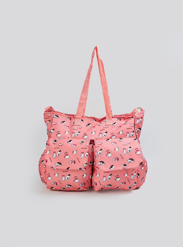 Perfect for travelling with infants, this diaper bag features cute all-over prints with flat handles and a detachable strap. It is designed with front flap pockets, side mesh pockets, a changing mat, and a spacious main compartment with multiple interior pockets.