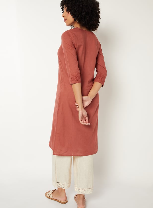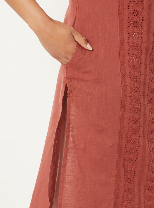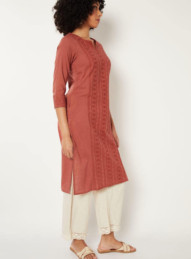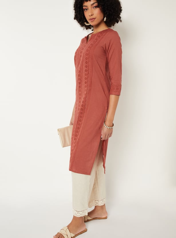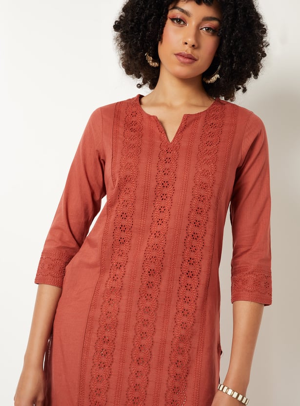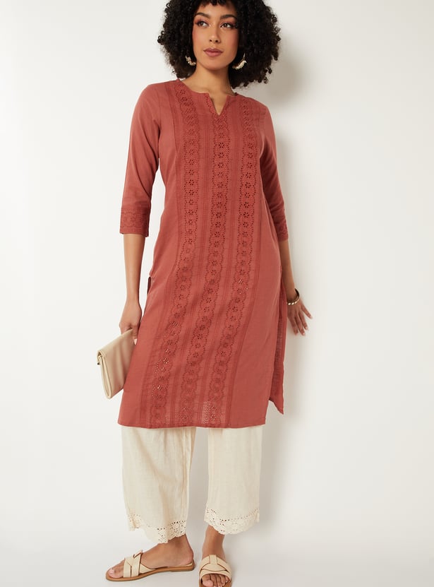 Delicate and elegant, this Schiffli straight kurta showcases intricate embroidery with a chic notch neckline and 3/4th sleeves. Side slits add ease of movement, making it a perfect blend of style and comfort for any occasion.