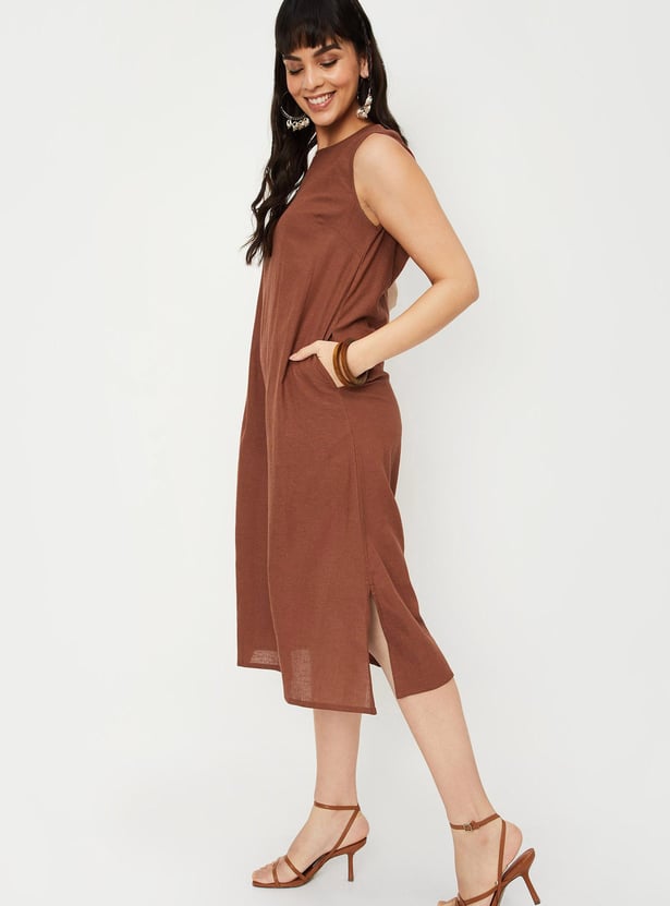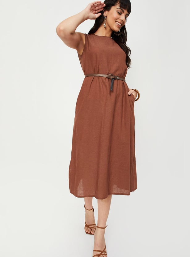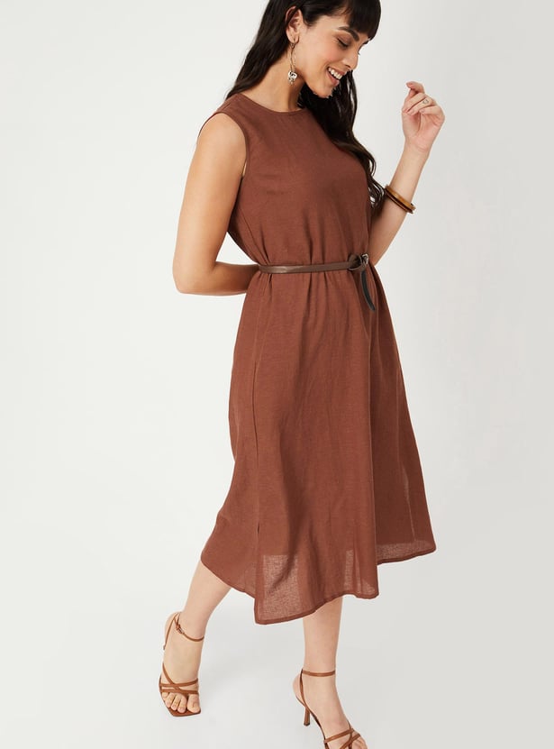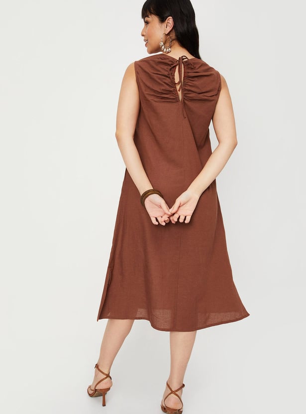 Slay the casual collection with this solid A-line dress. It flaunts a round neck, sleeveless, back tie-up detail, slit detail, and a midi silhouette. Team it up with a pair of chic heels to make a statement.