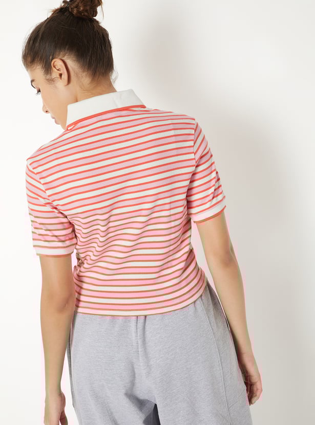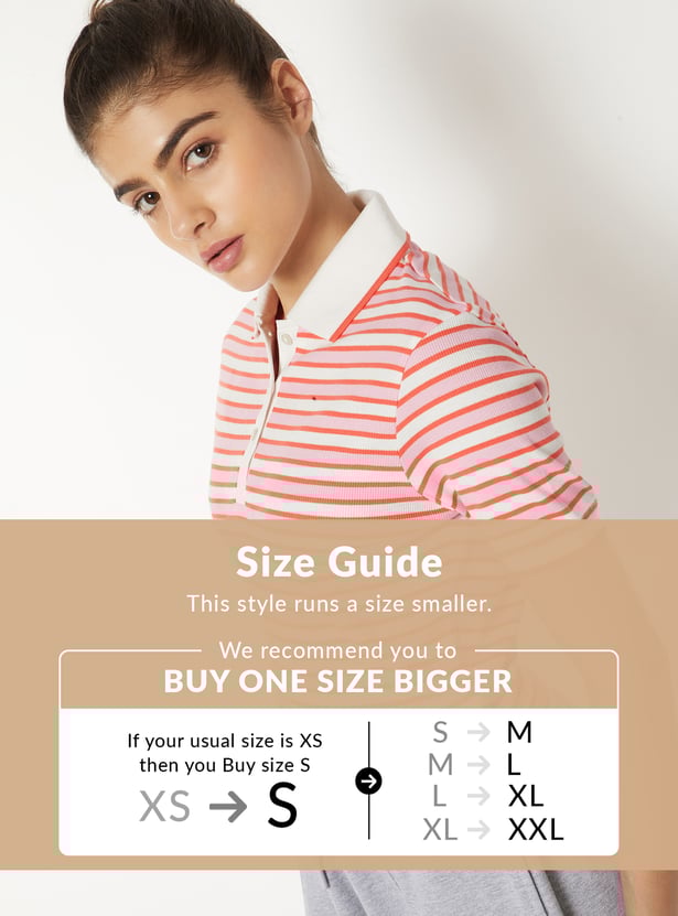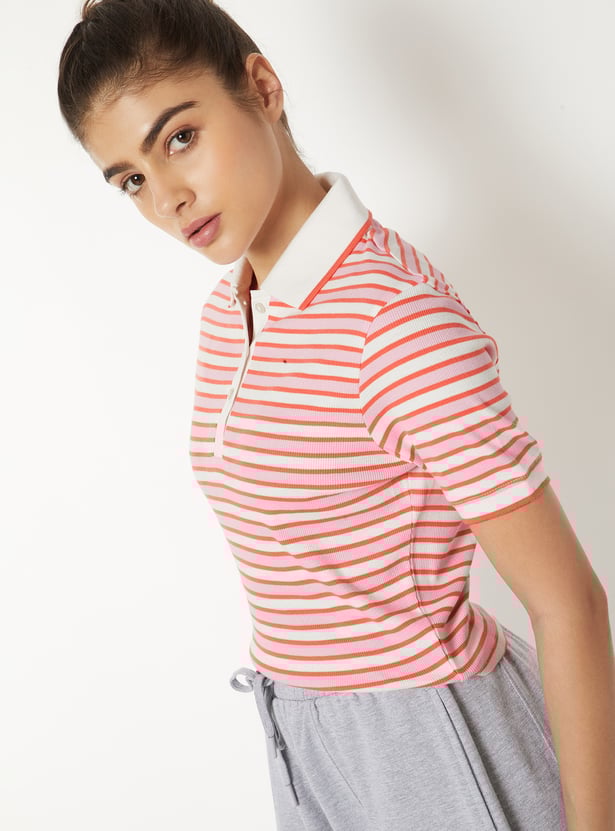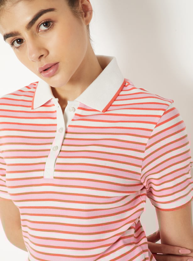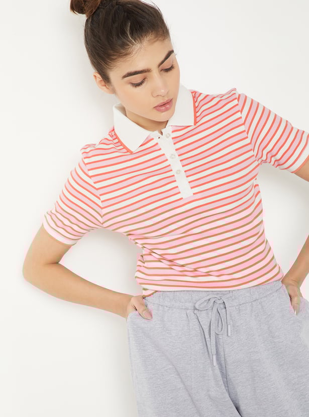 Add a classic touch to your casual wardrobe with this striped polo T-shirt, designed with a polo collar and a neat button placket. The half sleeves offer a relaxed feel, making it a comfortable choice for everyday wear.