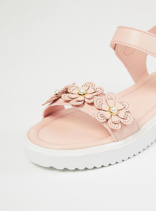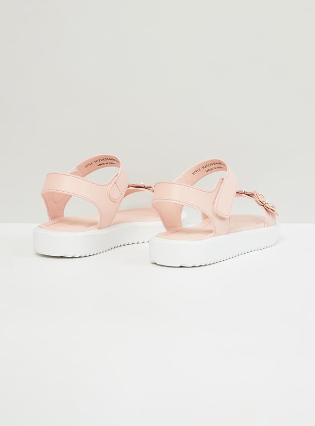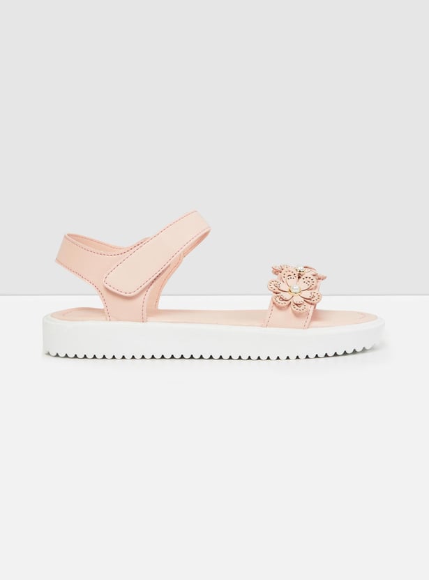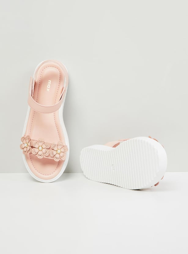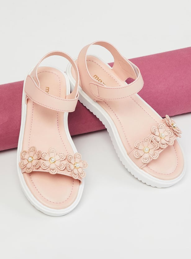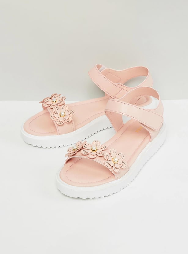This pair of velcro strap flats are defined by flower embellishments and comes with a comfortable footbed.