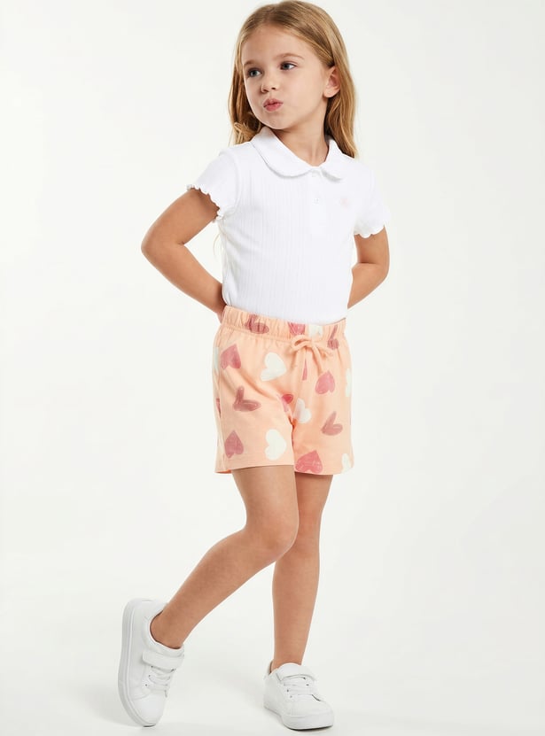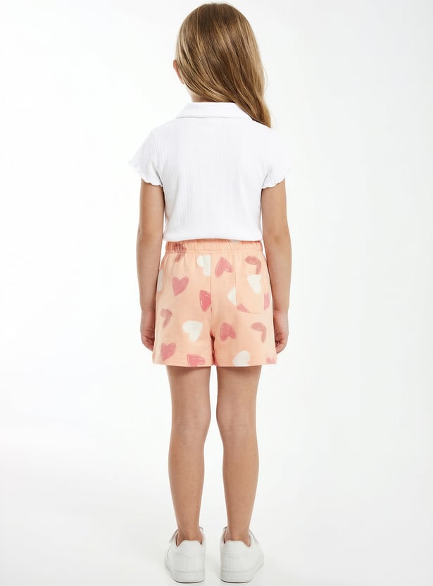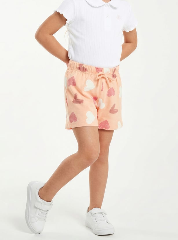 Sweet her style with this pair of shorts. It is highlighted with heart prints, a drawstring waist, and a back patch pocket.