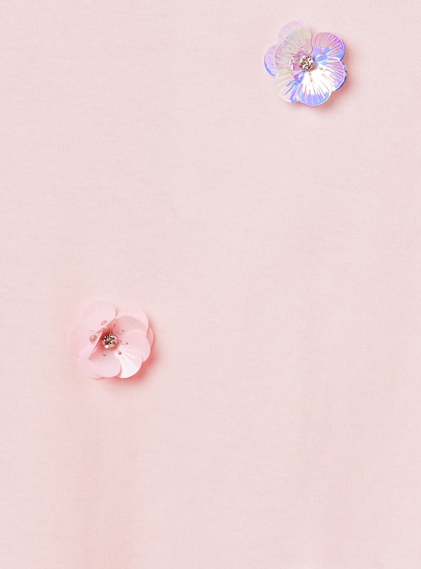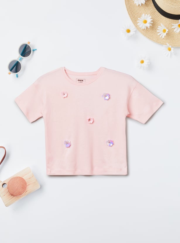 Sparkle and shine in this embellished crop T-shirt. Designed with a comfy round neckline and breezy half sleeves, this tee features eye-catching embellishments that add a playful touch of glam.