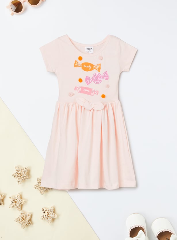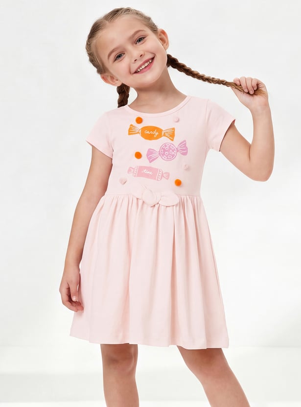 Add a playful flair to her wardrobe with this dress. Designed with a round neck and half sleeves, it features candy prints on the bodice. The bow accent at the waist and pompom detailing make it perfect for playdates and weekend outings.