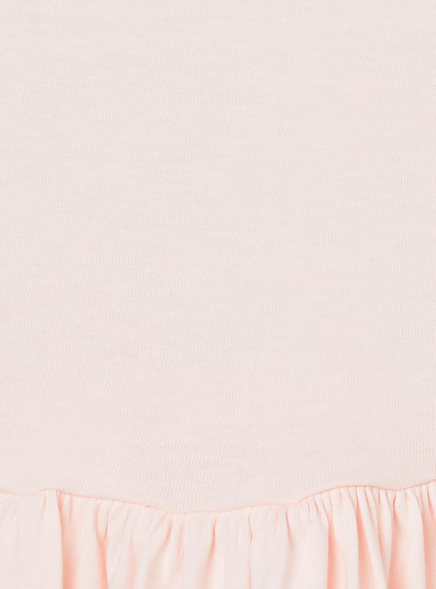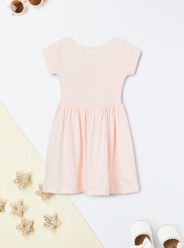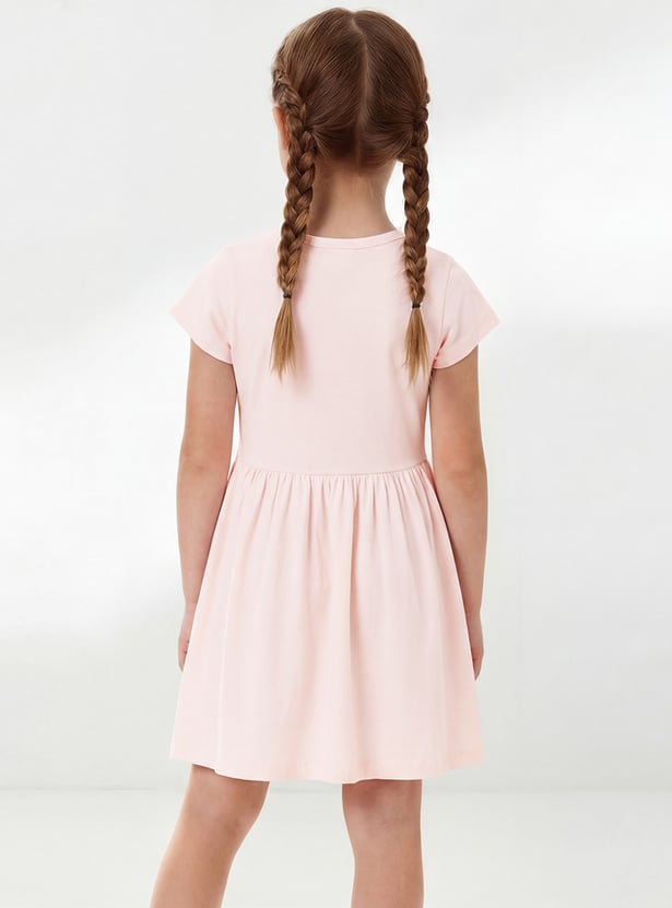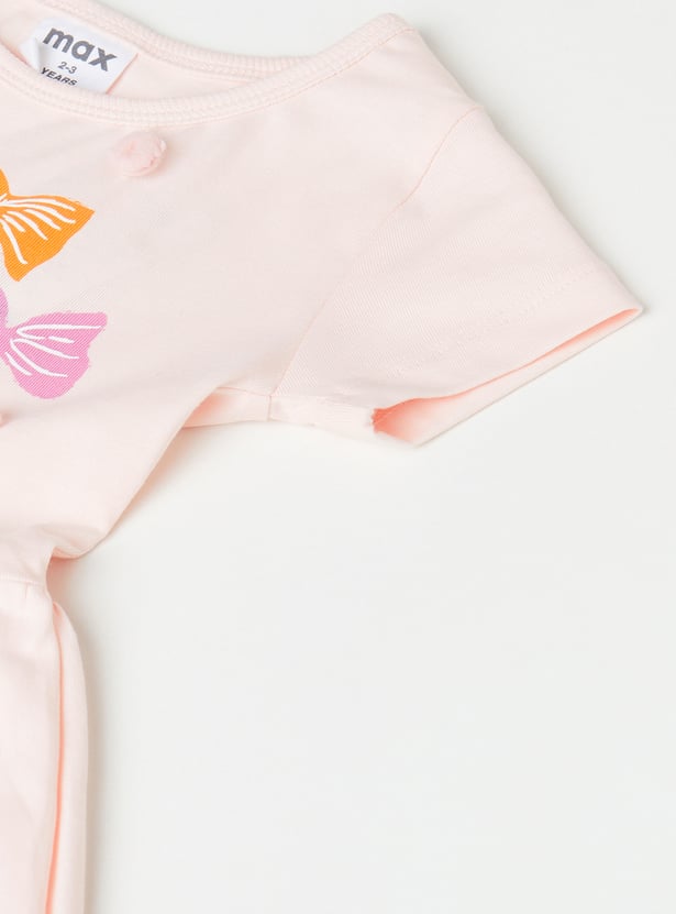 Girls Printed Dress with Pompom Accents
