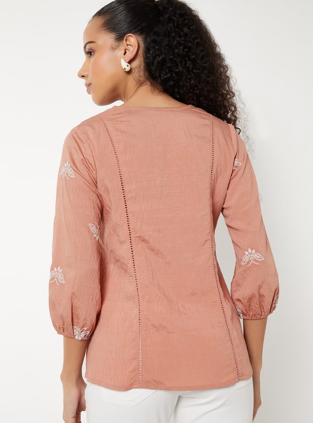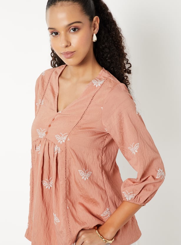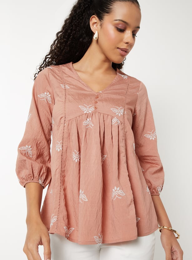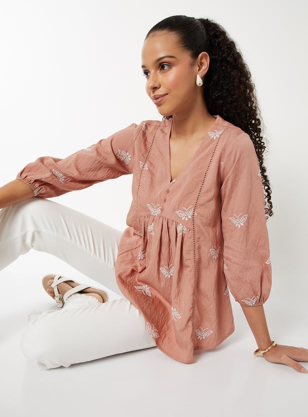 Elevate your ethnic wardrobe with this embroidered A-line tunic, featuring a flattering V-neck, 3/4th sleeves, and delicate gathers on the surface for added texture and charm.