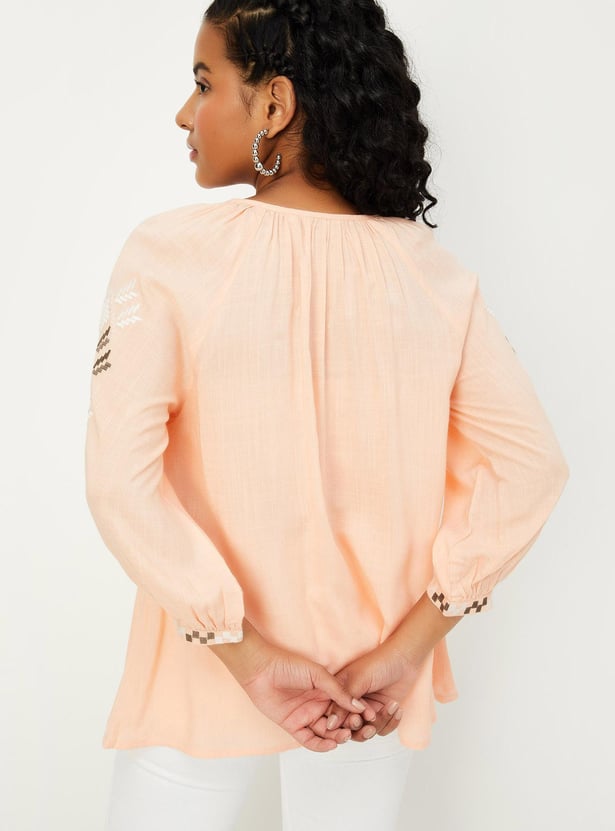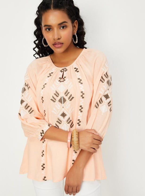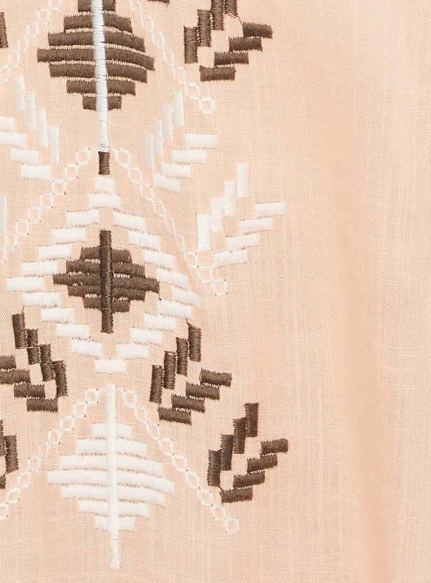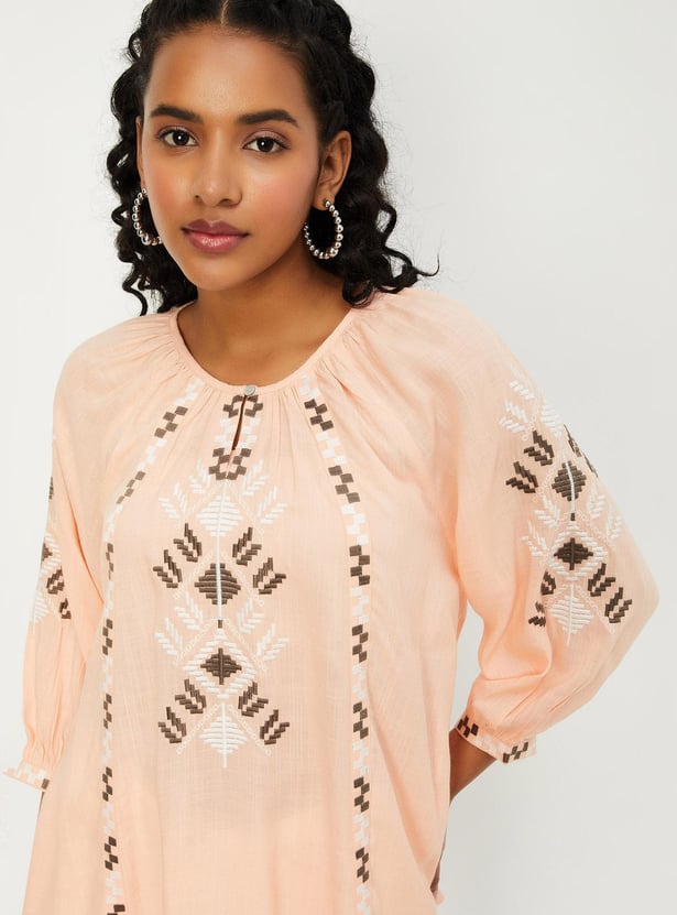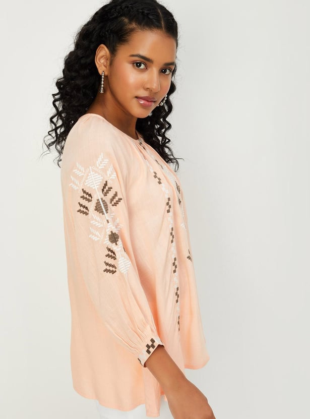 Elevate your style with this embroidered top featuring three-quarter sleeves, a round neckline with a single-button closure, and a curved hemline. The intricate embroidery adds a touch of femininity to the attire, creating a chic and versatile piece that effortlessly transitions from casual outings to more refined occasions.