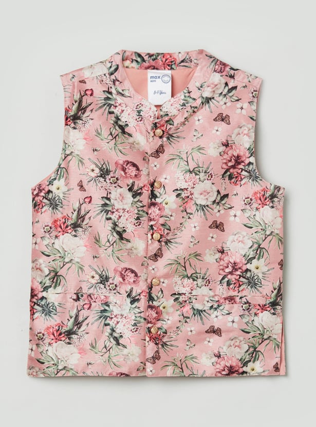 This stylish Nehru jacket is adorned with an all-over print on the surface, a sleeveless construction, and a band collar.