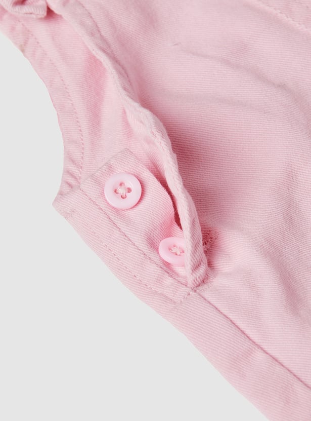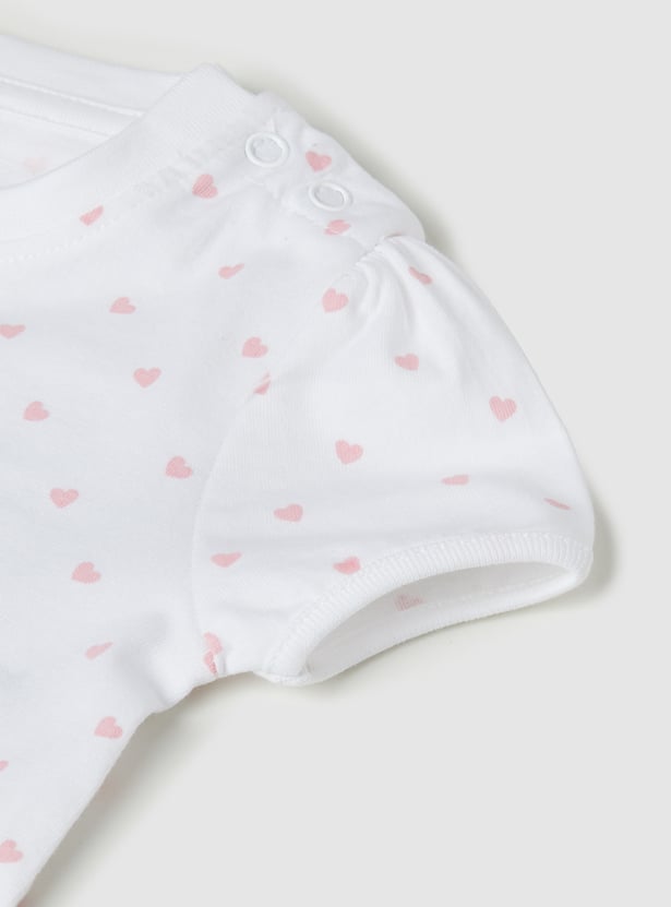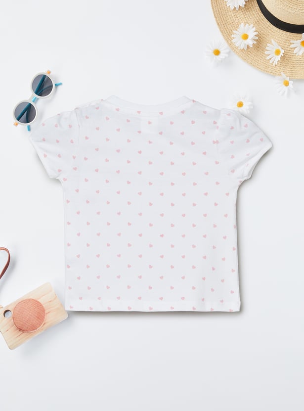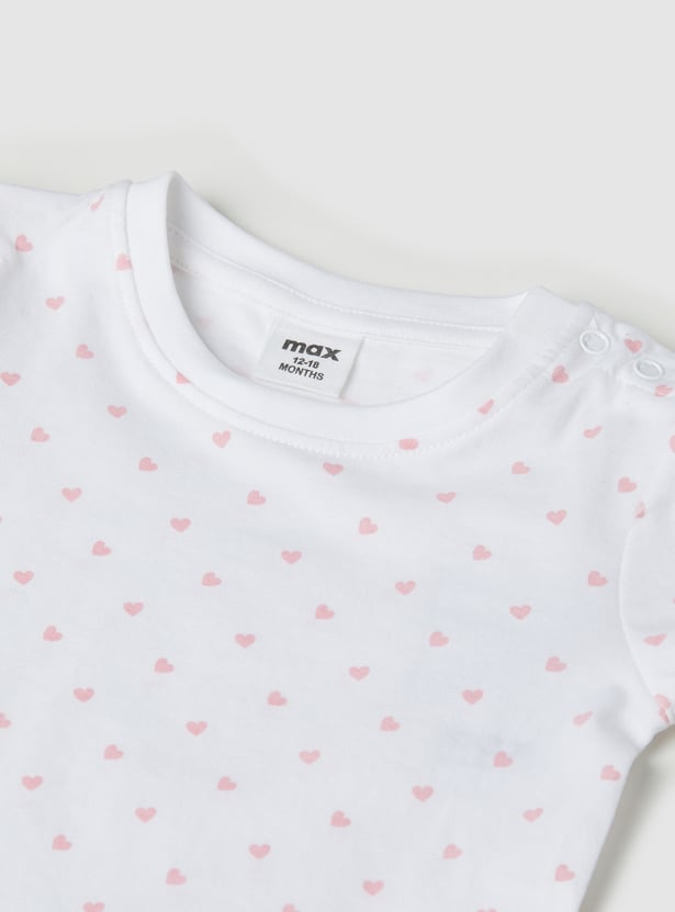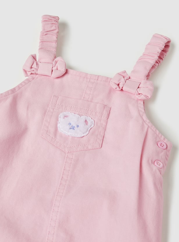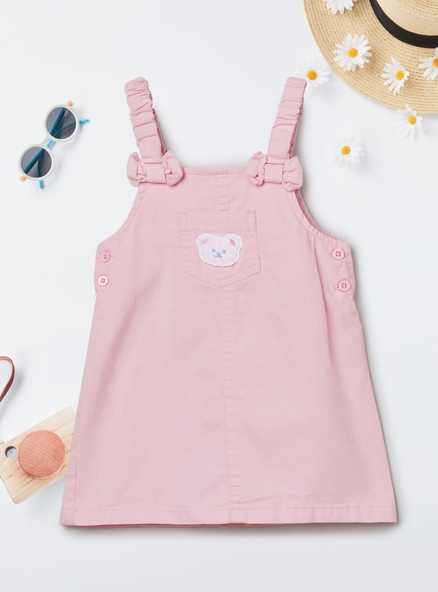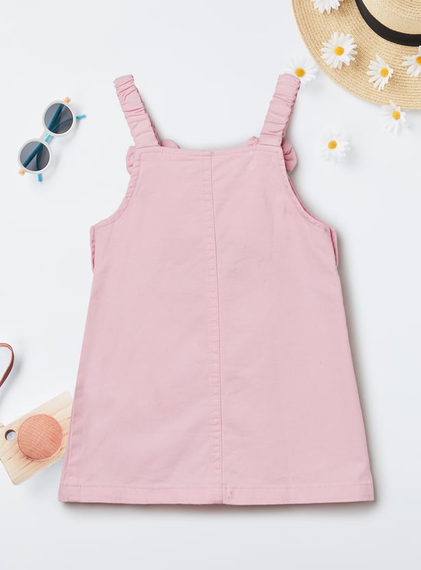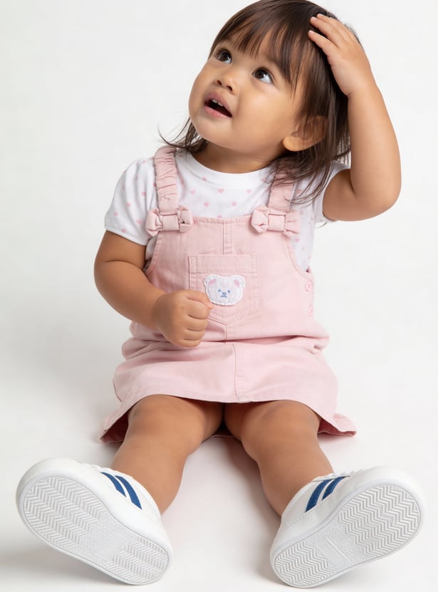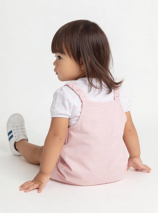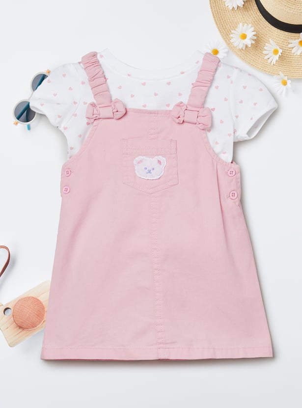 Charming and playful, this set features an applique a-line dress with shoulder straps and a square neck, offering a stylish layered look. It is paired with a printed T-shirt designed with a round neck, half-sleeves, and a convenient snap-button closure, blending comfort with a touch of fun detail.