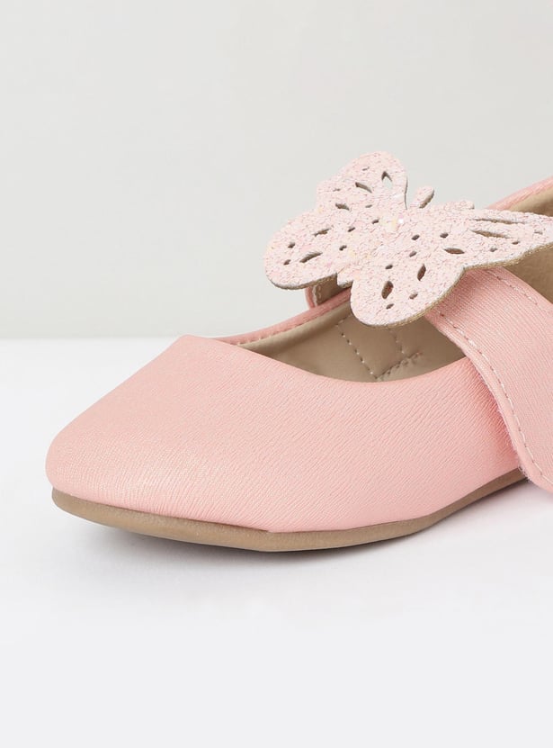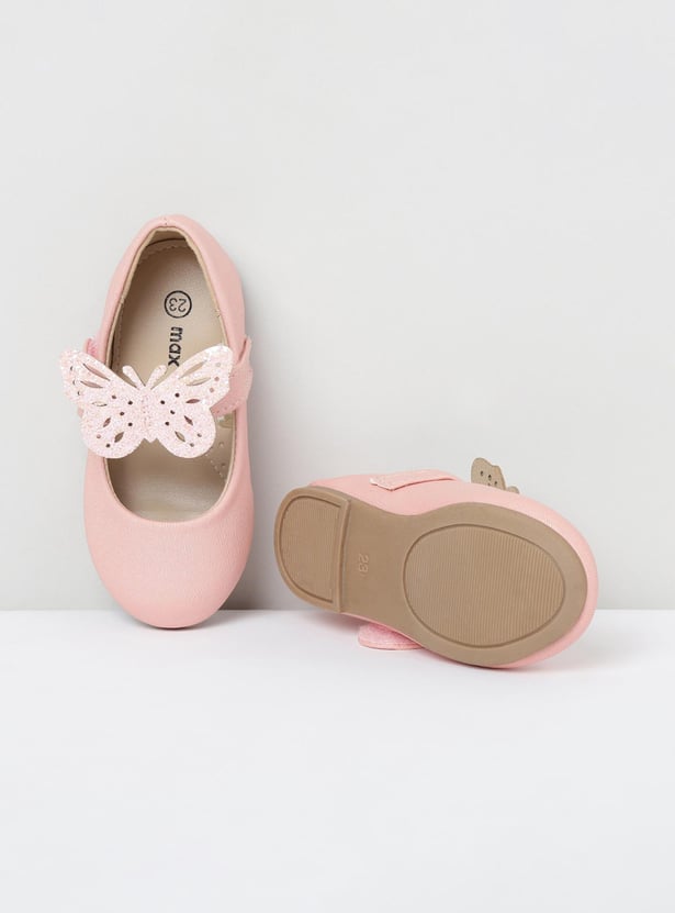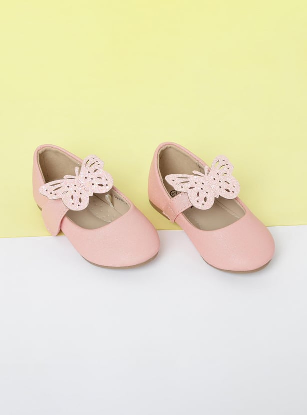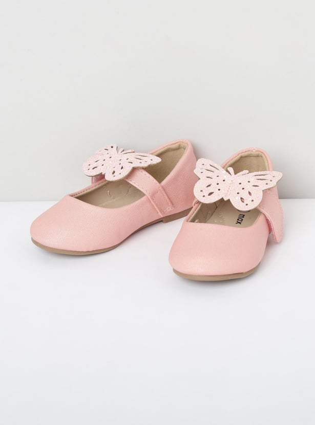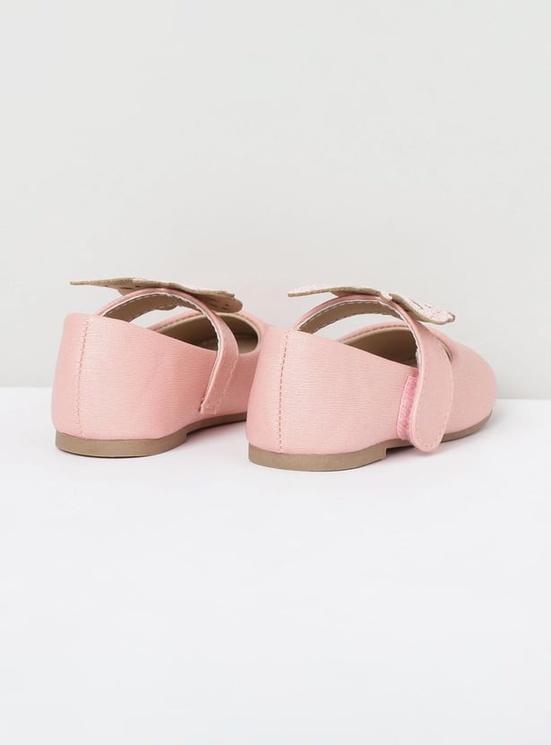 This pair of Mary Janes are complemented with an applique detailing, rounded-toe silhouette, and a velcro closure to add to the look.