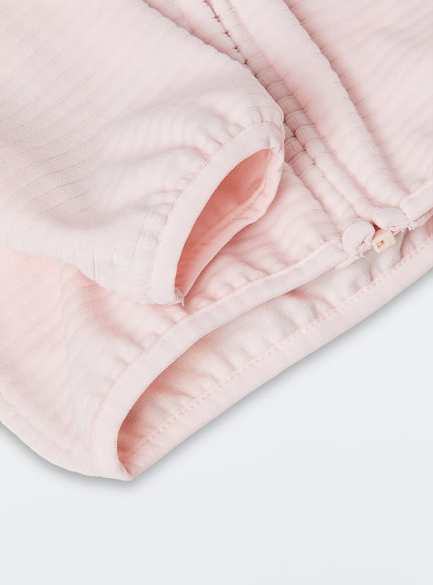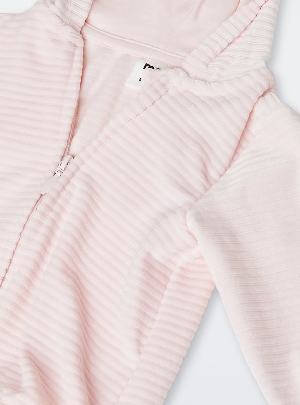This cosy jogger set is the perfect start for winters. The sweatshirt features an applique hood with a zip closure and full sleeves, offering warmth and a trendy look. Paired with elasticated waist joggers, this set ensures a snug and comfortable fit for all-day wear.