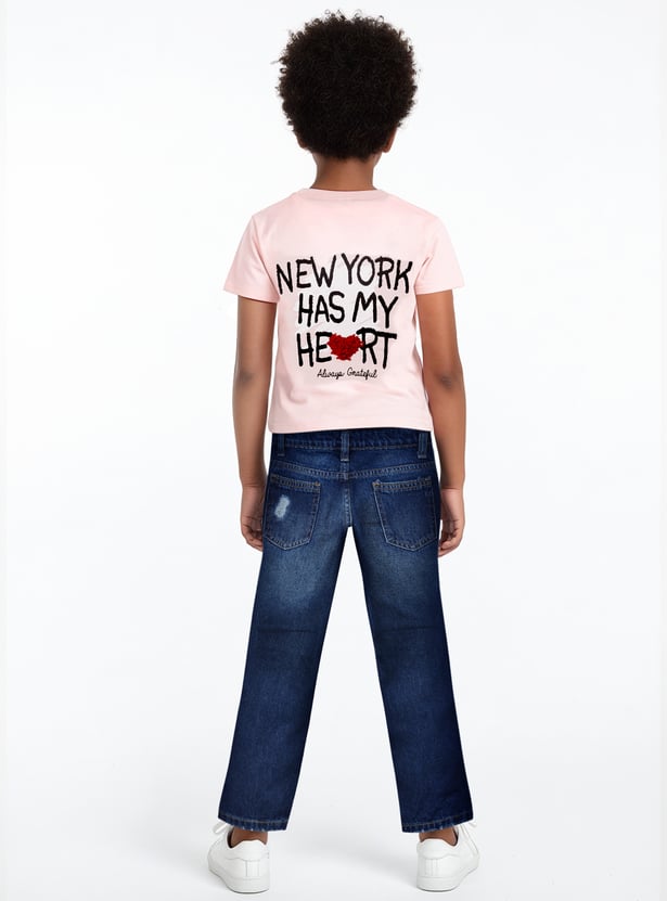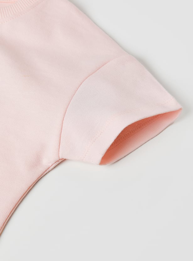 Trendy and fun—this appliqué oversized crop T-shirt is a style statement! Designed with a comfy round neckline and relaxed half sleeves, this oversized crop fit brings effortless cool to her wardrobe.