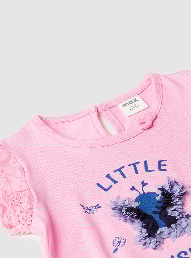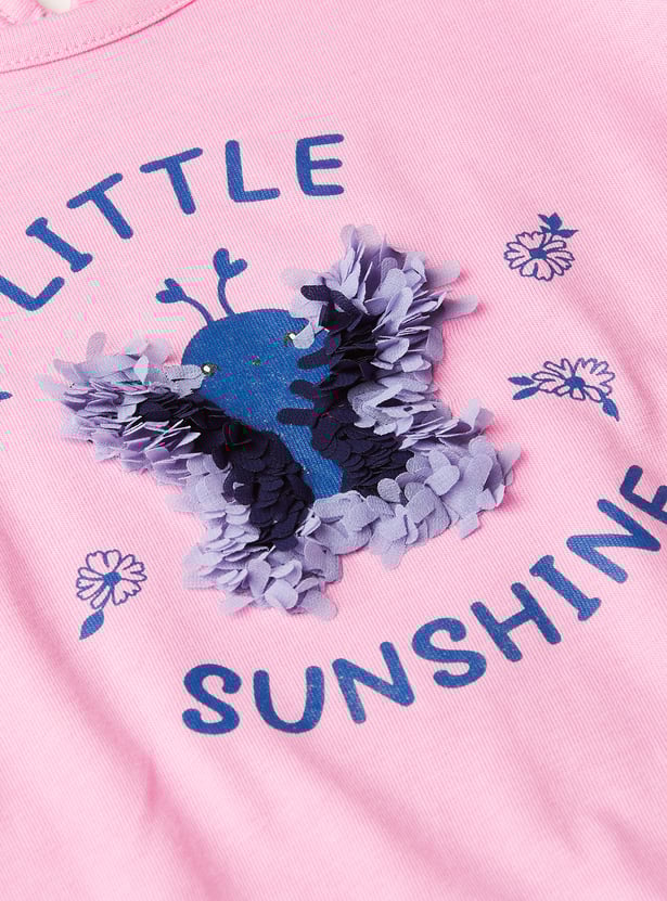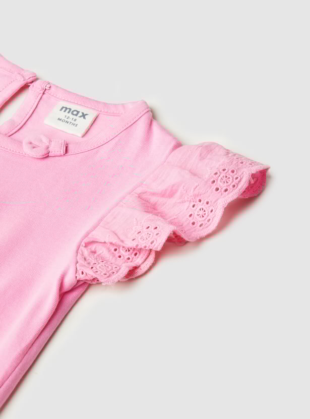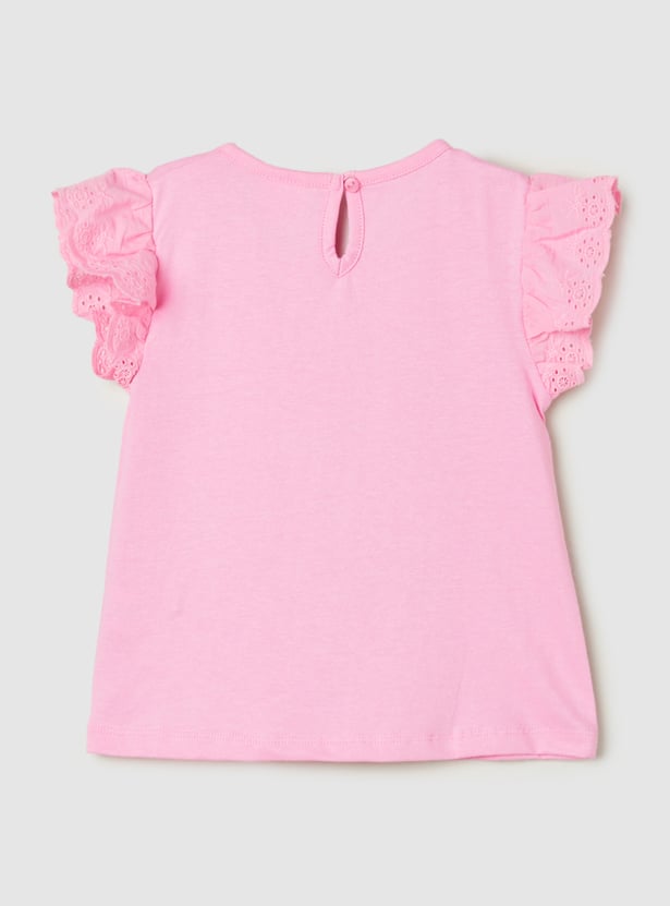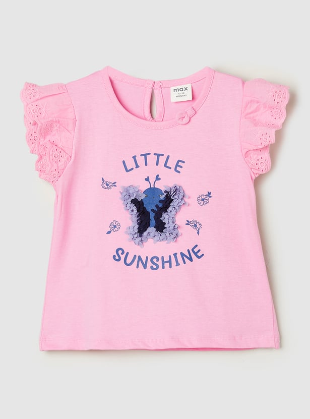 Elevate your casual collection with this stylish t-shirt, boasting an appliqued surface, a flattering round neckline, and delicate schiffli flutter sleeves.