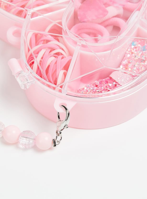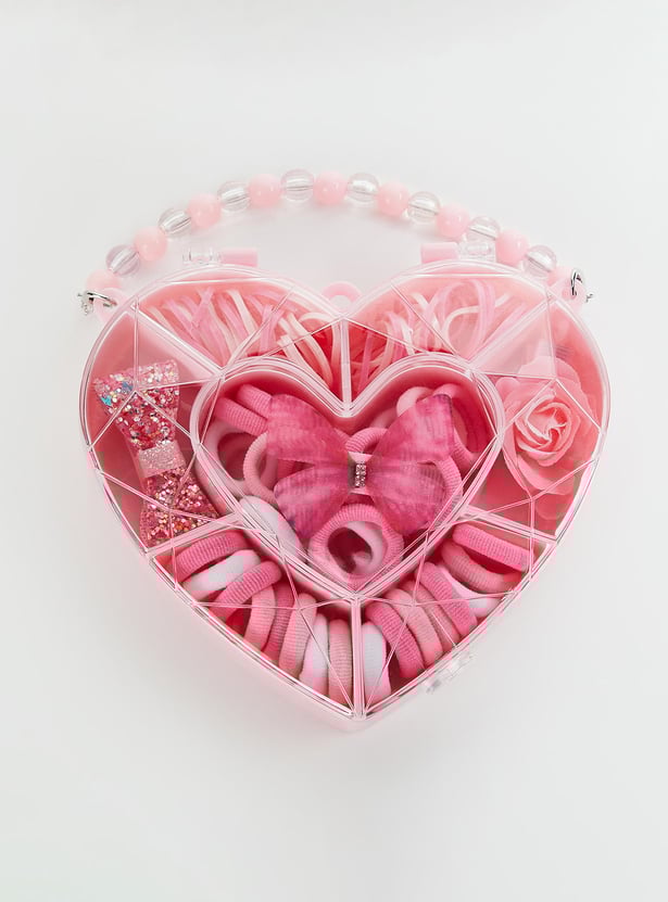 Satisfy her inner fashionista by gifting her this adorable set. It includes rubber bands, hairbands, and assorted hair clips that let you dress up her hair in versatile ways. These accessories come in a heart-shaped box with a beaded handle.