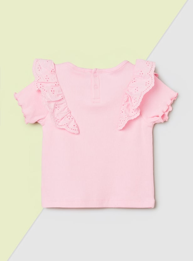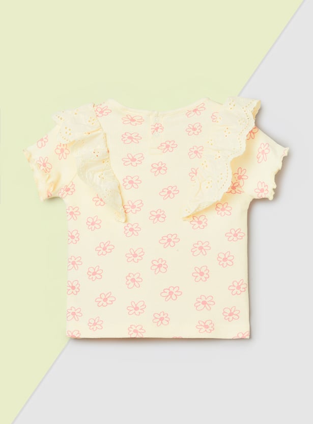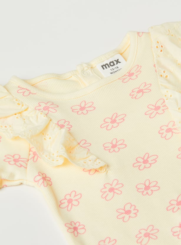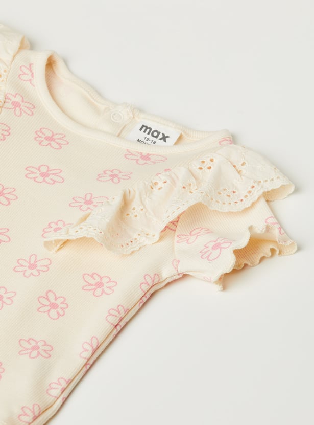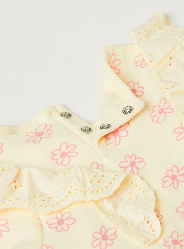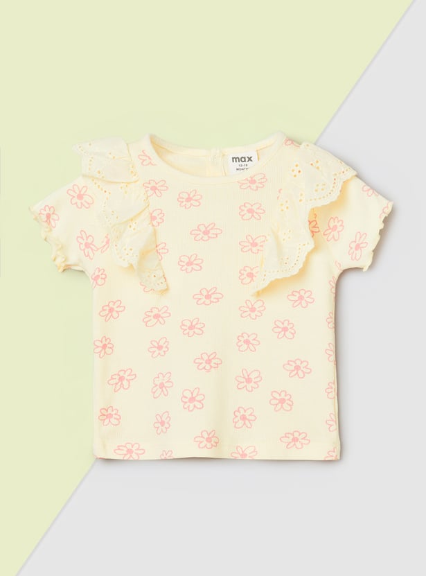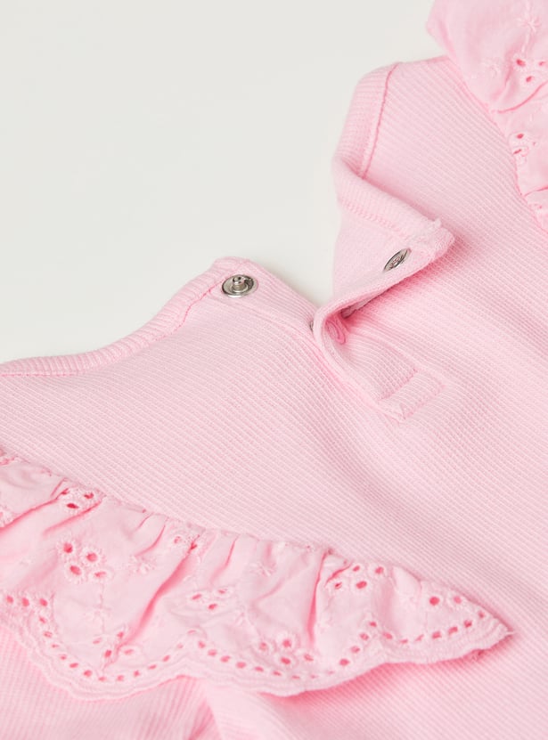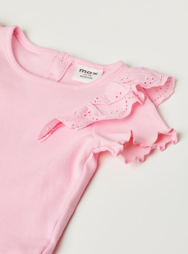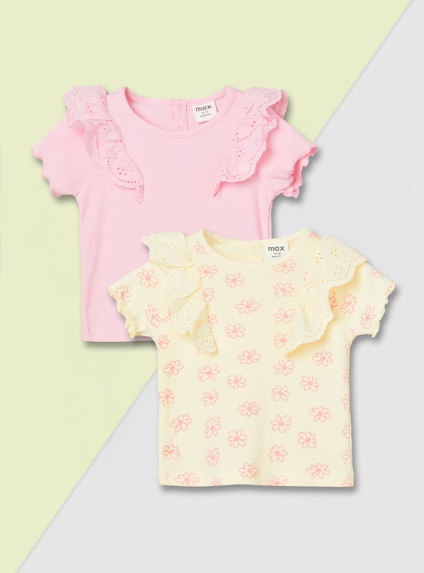 This versatile pack includes two stylish tops - one printed Top and one ribbed top, both featuring a round neck, half sleeves, and button closure. Finished with delicate schiffli embroidery on ruffle details for a touch of elegance.