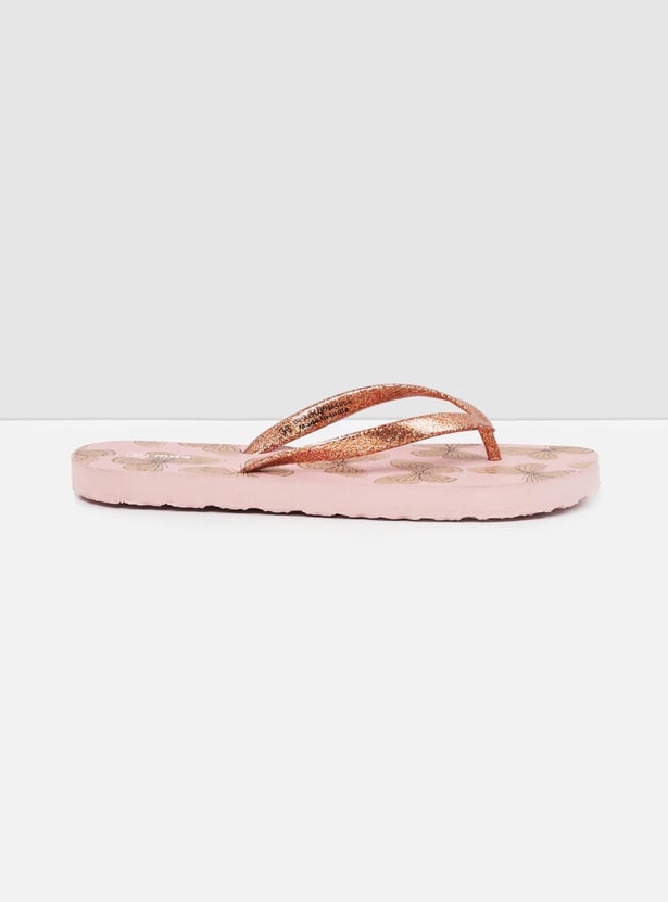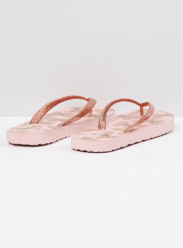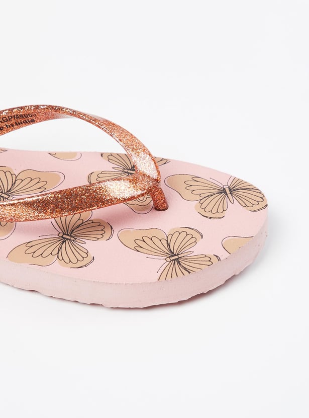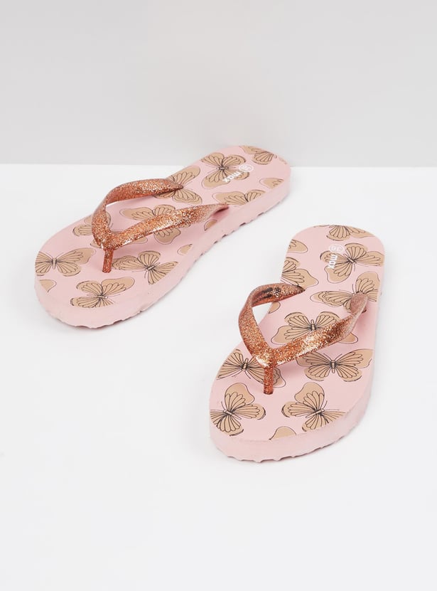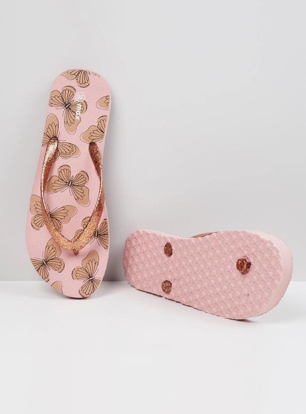Detailed with butterfly prints on the surface, this pair of flip flops comes with v-strap and a slip-on silhouette. The textured soles have been included to lend maximum grip and comfort on the go.