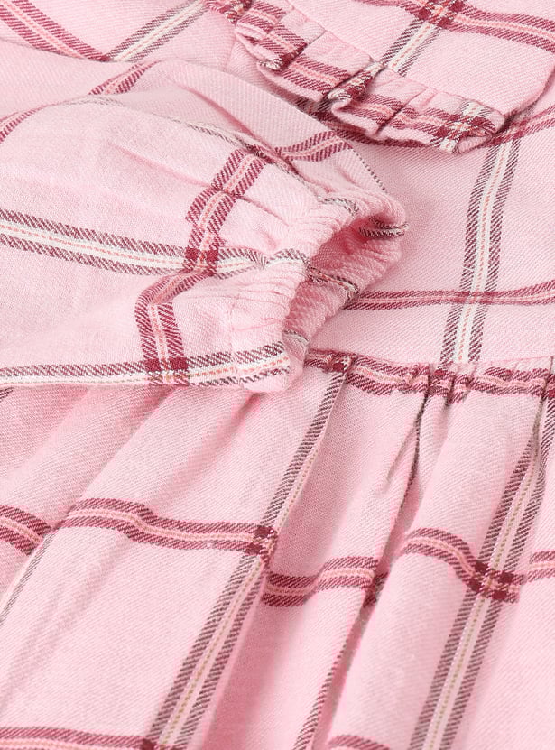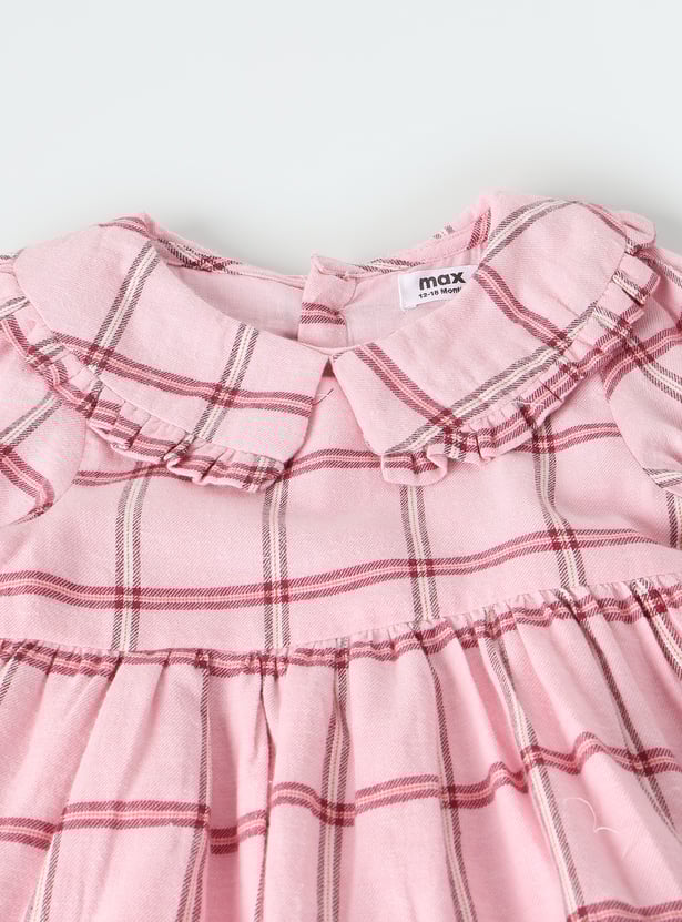 Bring a classic look with this dress. The tiered design has a checked pattern for a classic look. It has a Peter Pan collar, full sleeves, and gathered detailing.