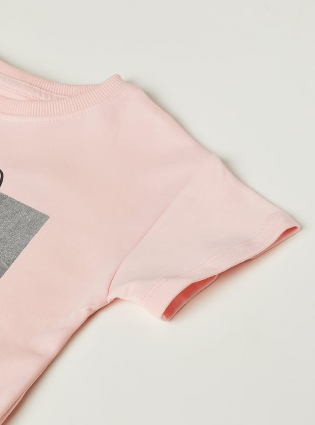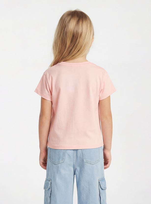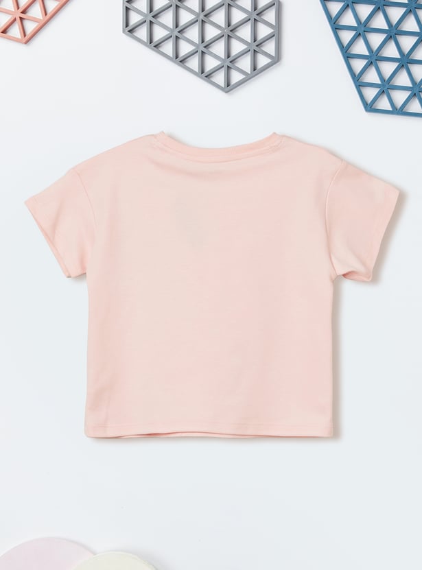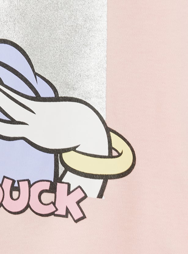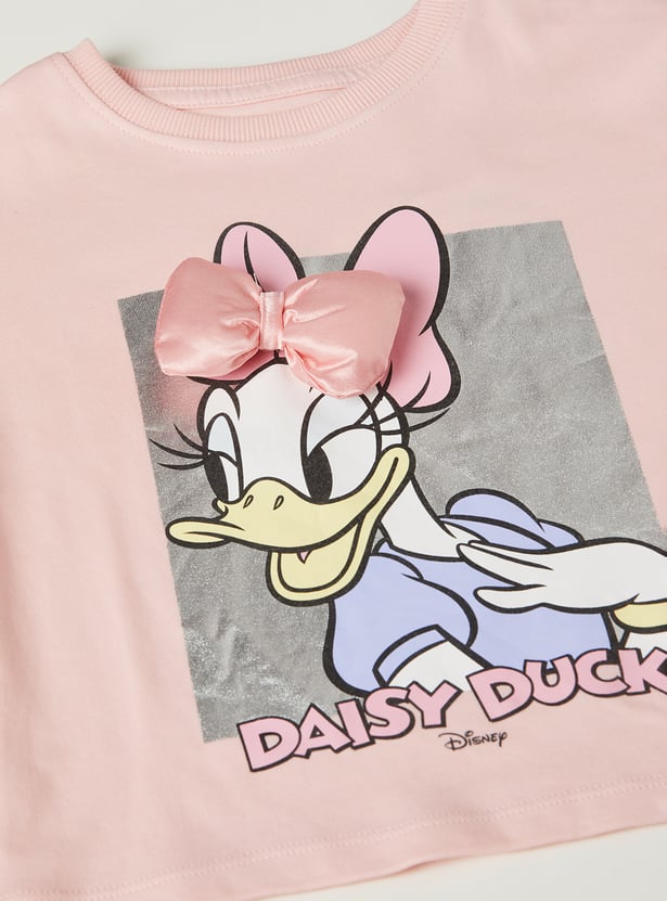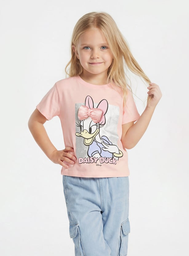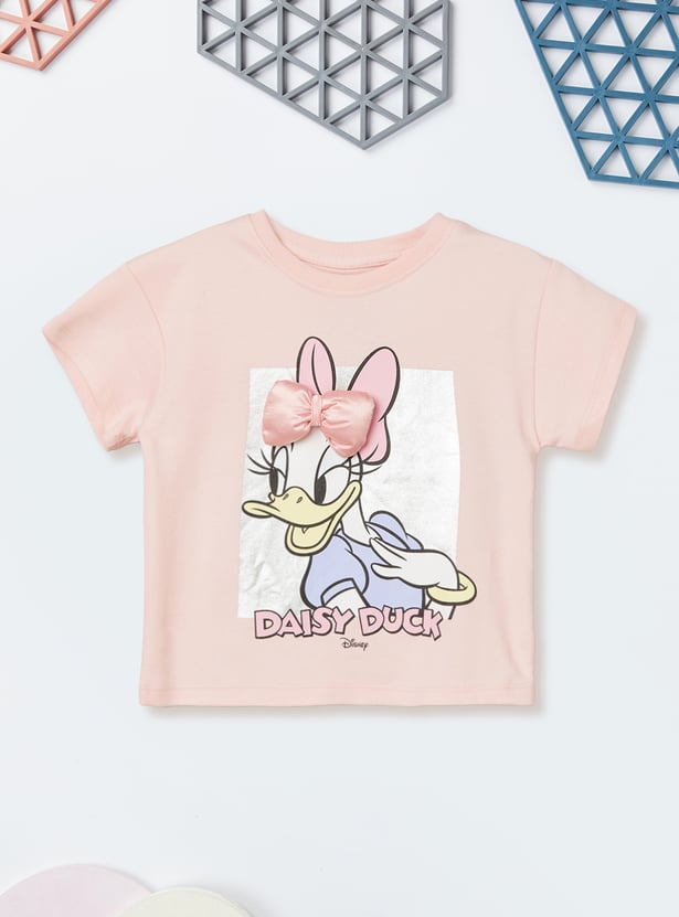 Add a playful touch to her everyday style with this T-shirt. It features a classic round neck and comfortable half sleeves for easy wear. The front showcases a Daisy Duck graphic print enhanced with a bow applique for added detail and charm.