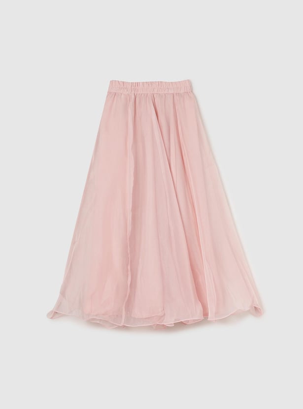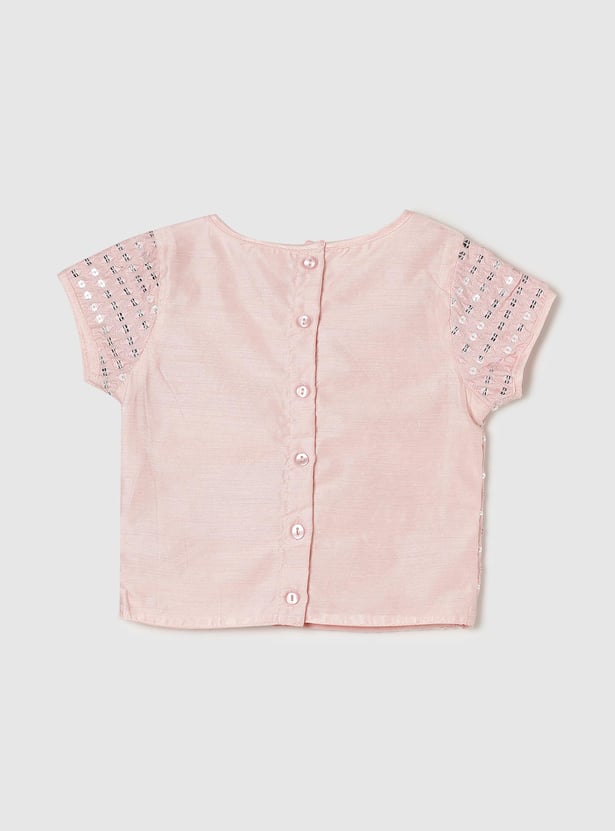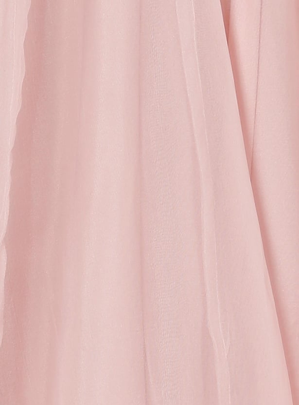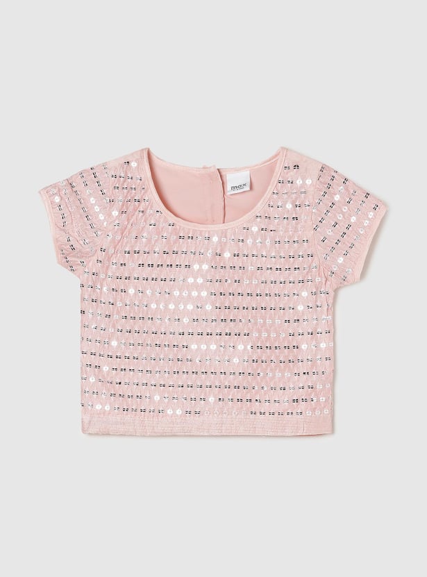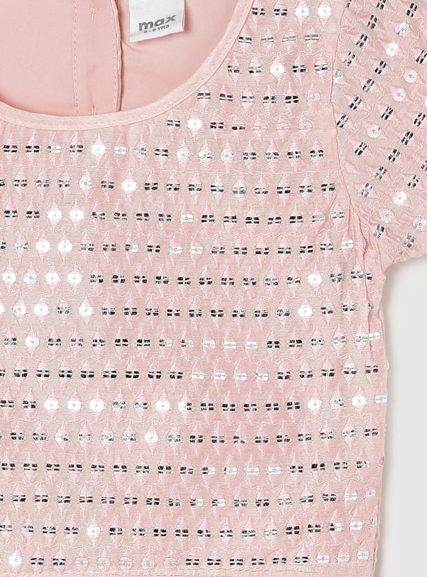 Dress for occasions and celebrations with this ethnic set featuring an embellished blouse with a round neckline and short sleeves. It is complemented with a maxi skirt with an elasticated waist and a dupatta with a border.