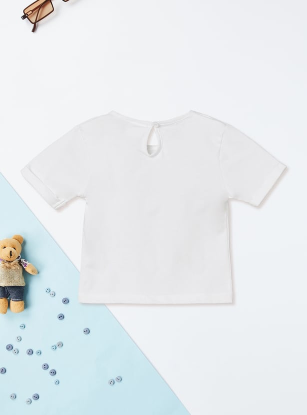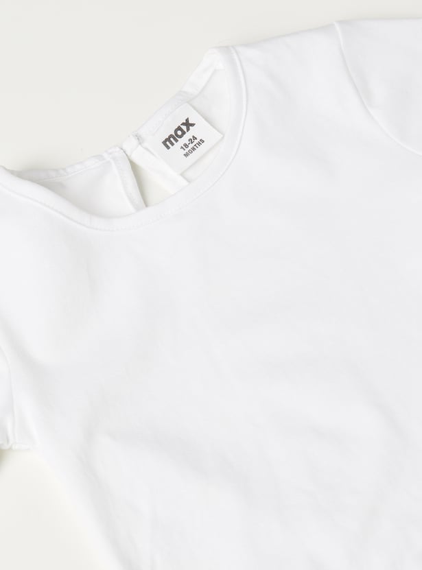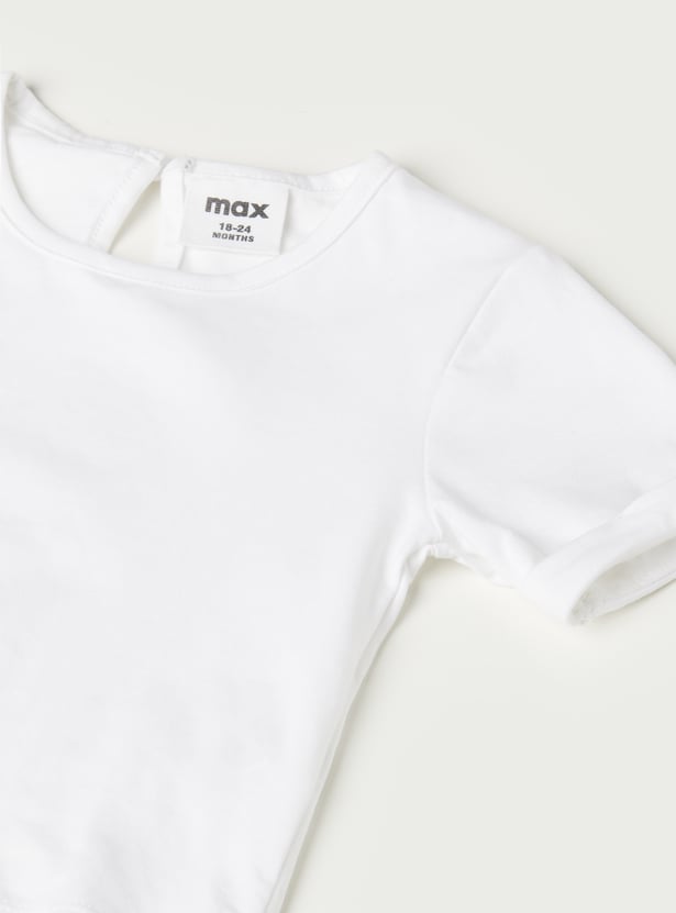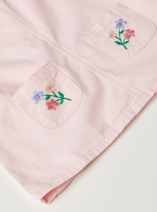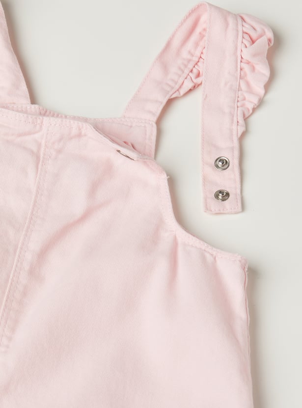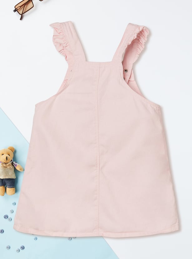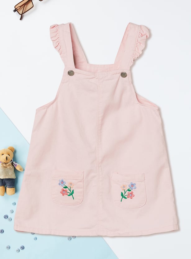 Add playful charm to your wardrobe with this embroidered pinafore dress, featuring a square neck and handy hem pockets. It comes with a solid t-shirt underneath, styled with a round neck, half sleeves, and button closure for an effortlessly cute layered look.