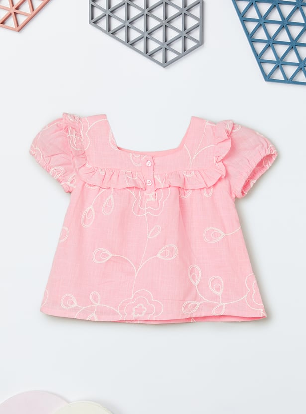 This set features an embroidered top with a square neck, button closure, and half sleeves, paired with elasticated waist shorts for comfort and style. Perfect for casual wear with a charming, coordinated look.