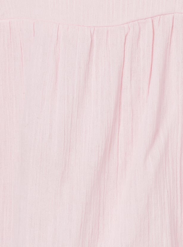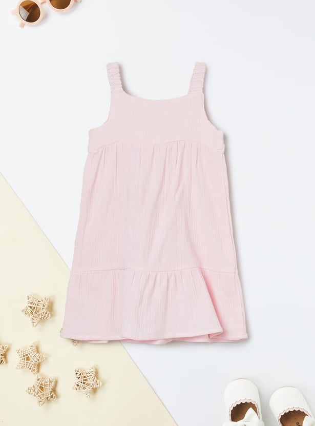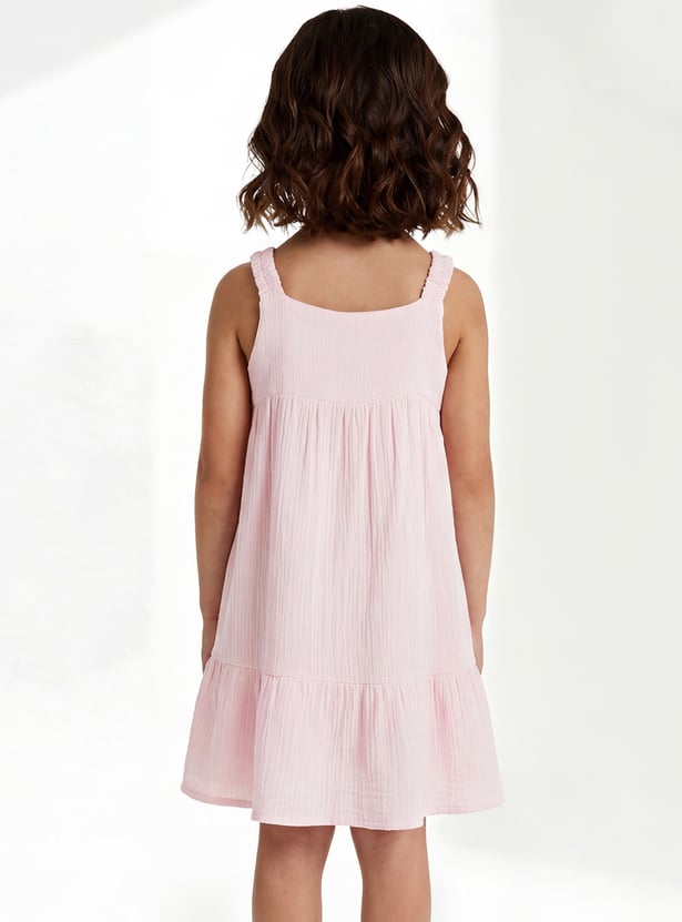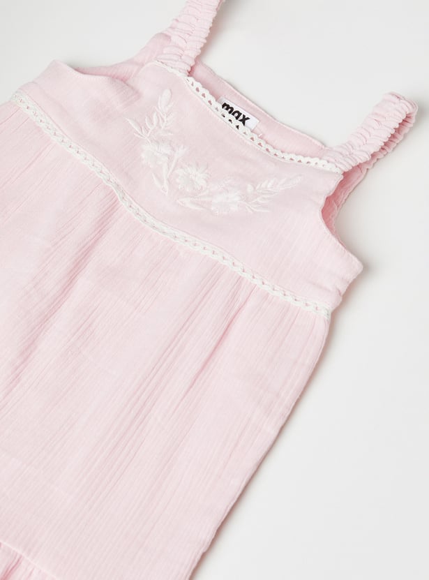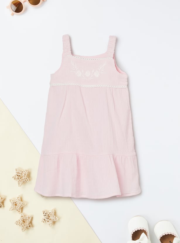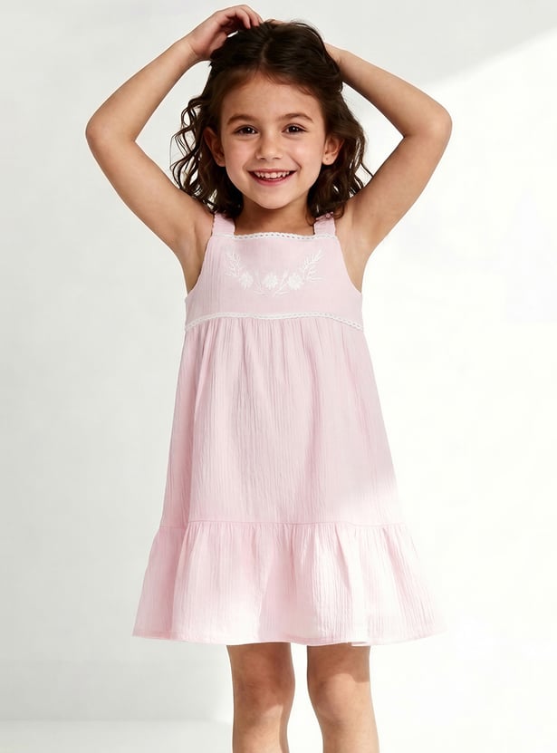 Add a charming touch to her wardrobe with this sleeveless dress. Designed with lace trim and an embroidered bodice, it features a square neck and textured finish for added detail. Finished with a flounce hem, it creates a playful and elegant look.