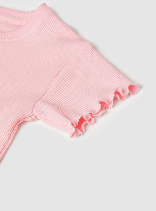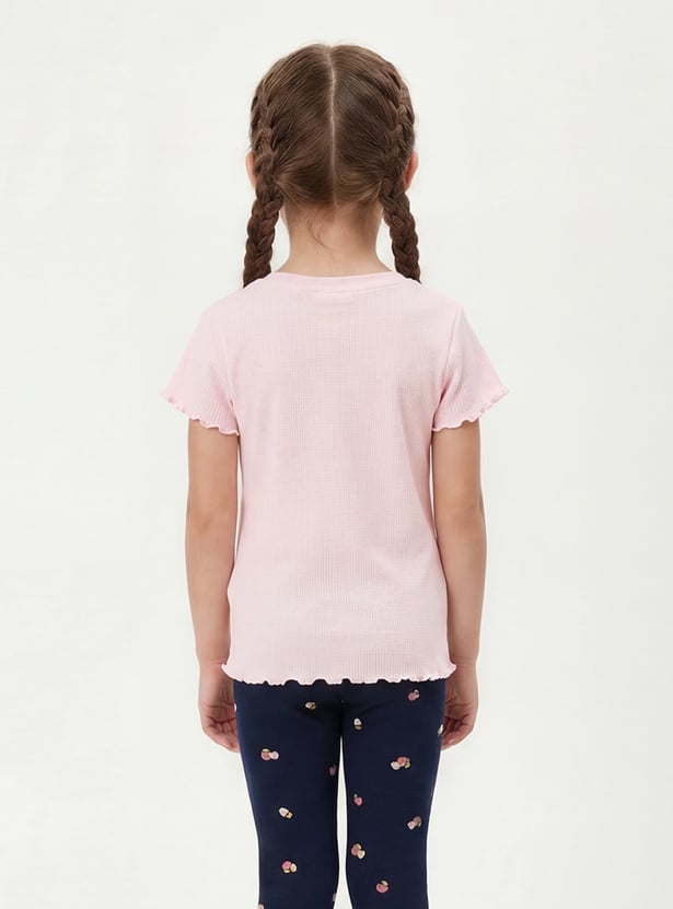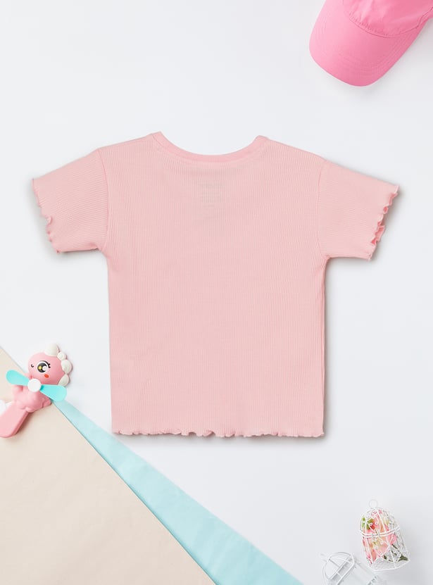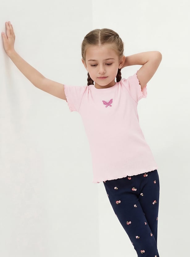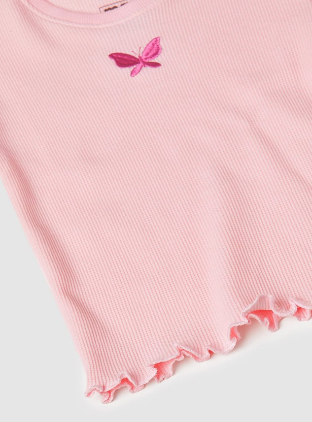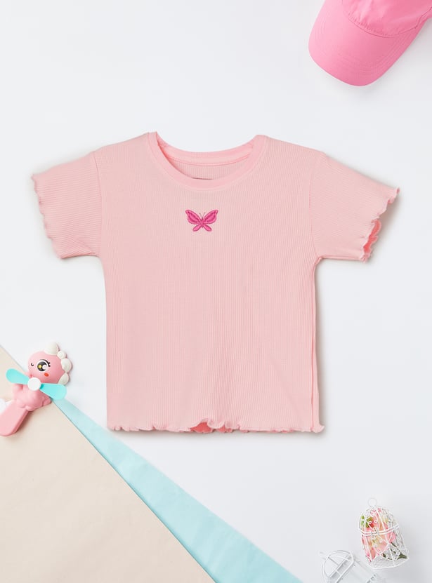 Charming and unique, this embroidered T-shirt features a round neckline, half sleeves, and a playful lettuce hem. The delicate embroidery adds a touch of artistry, while the lettuce hem detail gives the classic silhouette a trendy, feminine twist.