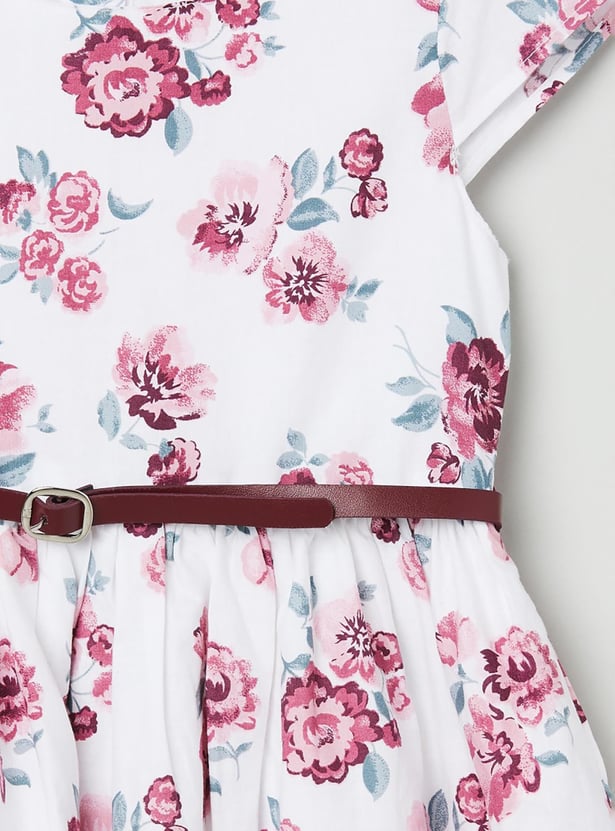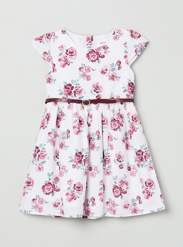 An ideal pick for any occasion, this A-line dress is designed with floral prints, round neckline, cap sleeves and a belt to complete the ensemble.