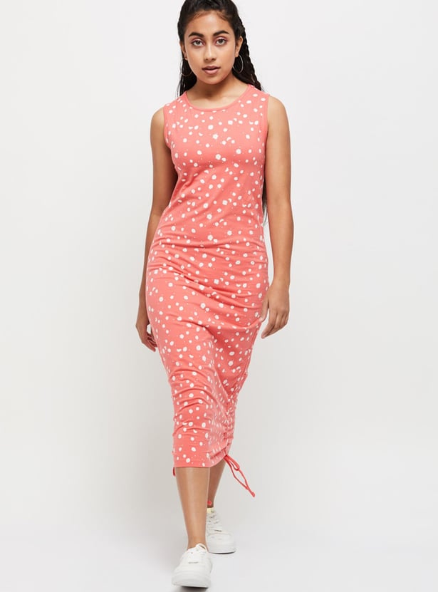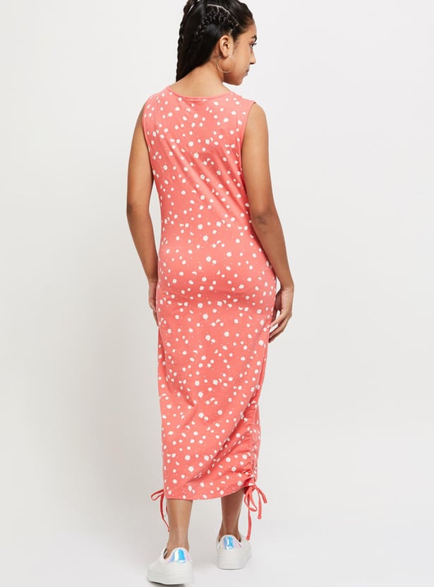 Elevate her style with this bodycon dress featuring floral prints, a sleeveless profile and a ruching detailing at the hem with a tie-up.