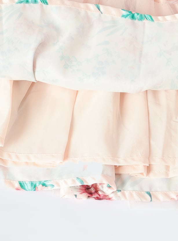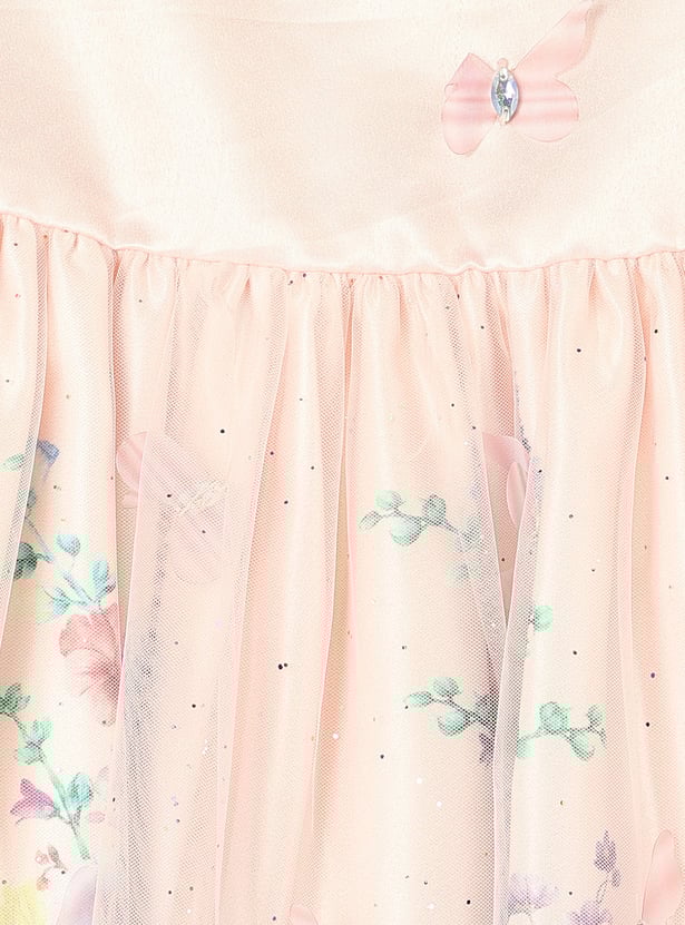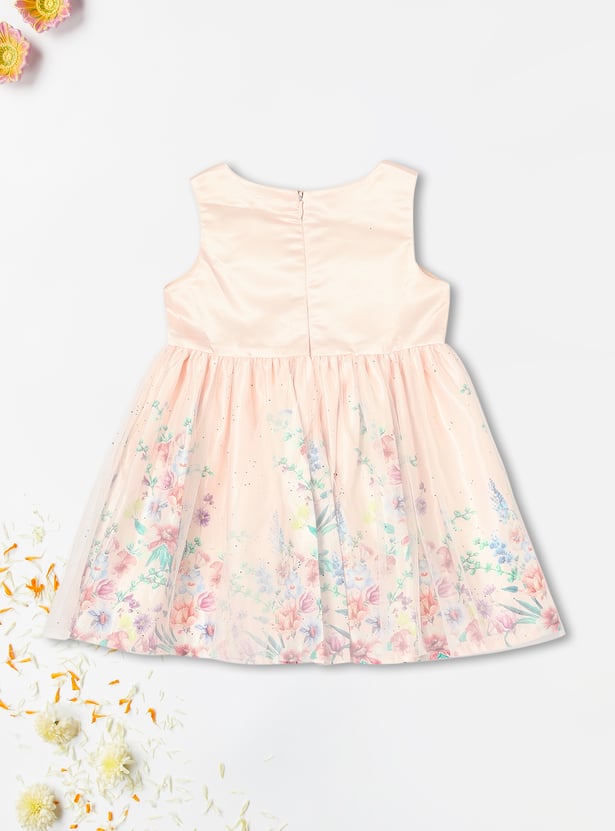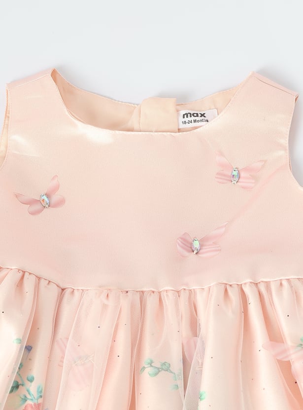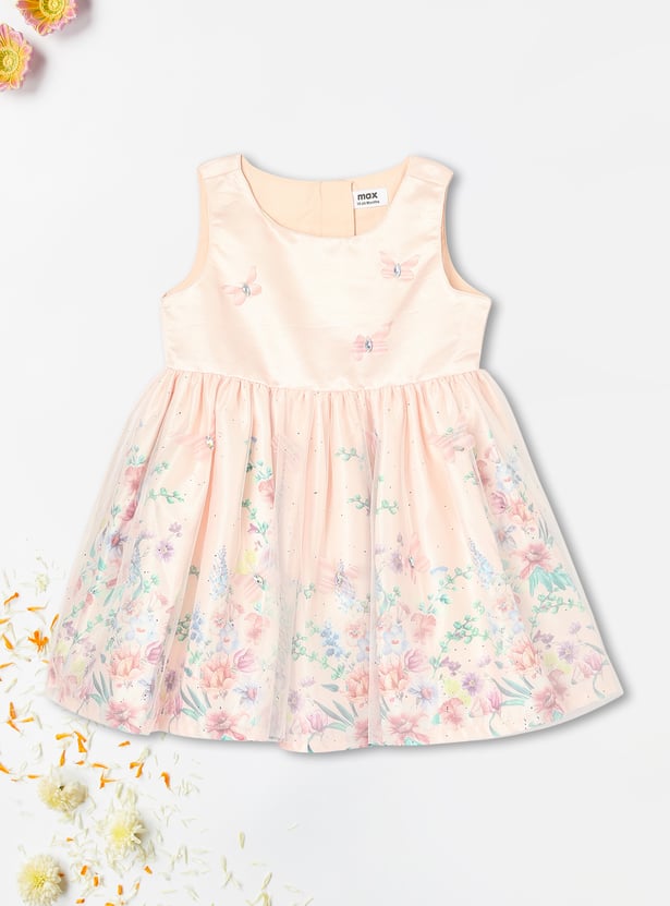 Your kid will have a happier day in this delightful printed fit and flare dress. Featuring a charming embellished design, this sleeveless design is perfect for twirling in style. The round neck with convenient zip closure at the back ensures an easy fit, making it a fun and fashionable choice for any occasion!