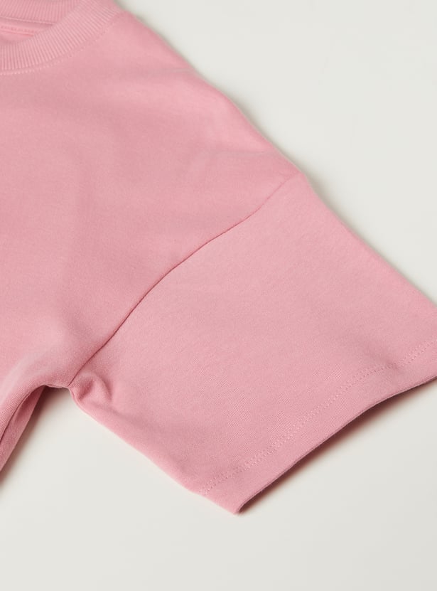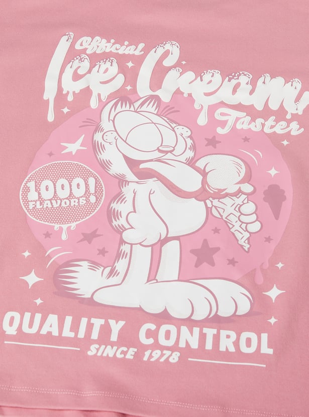 Add a fun, nostalgic staple to your wardrobe with this Garfield print oversized t-shirt. Featuring a round neck and half sleeves, it combines everyday comfort with the cheeky charm of everyone’s favorite lasagna-loving cat.