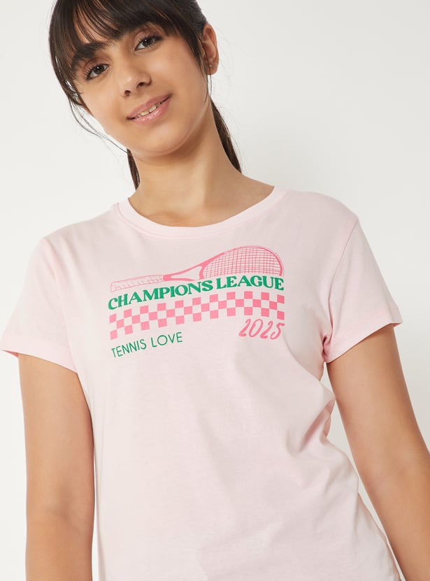 Let her express her style with this printed T-shirt, featuring a comfy round neckline and half sleeves for everyday ease. The playful prints add personality, making it perfect for school days, playdates, or weekend fun.