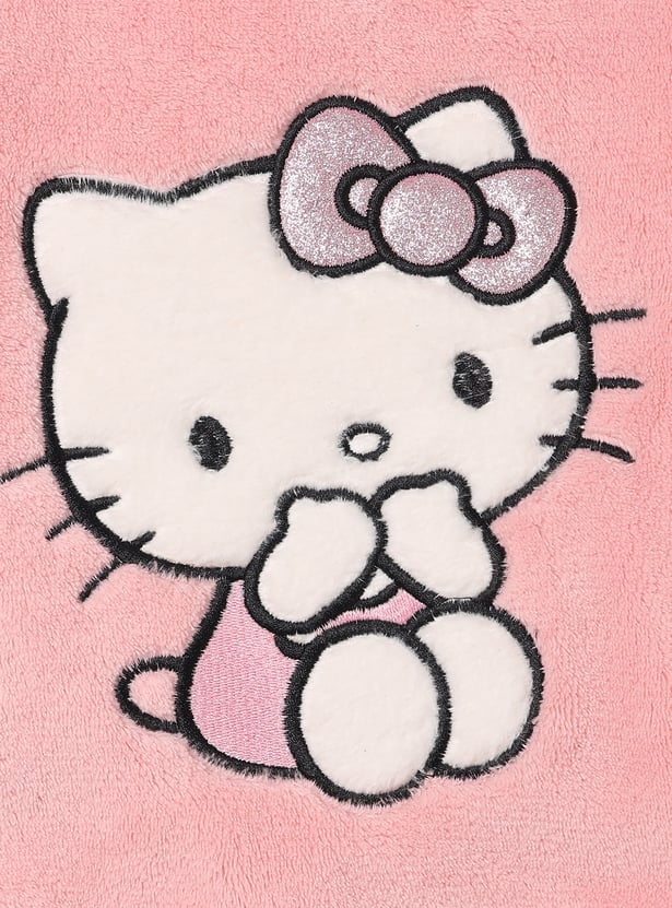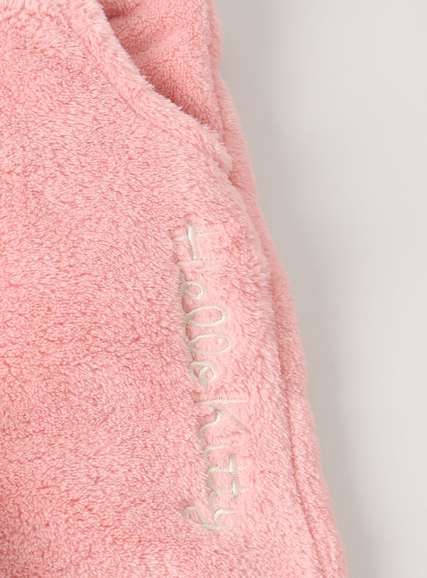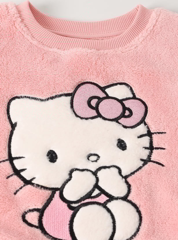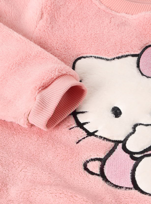 This Hello Kitty fuzzy jogger set for girls includes a full-sleeve T-shirt with a round neckline and ribbed hems, paired with matching joggers featuring an elasticated waist and drawstring. The soft texture and embroidered Hello Kitty design add a cozy, playful charm.