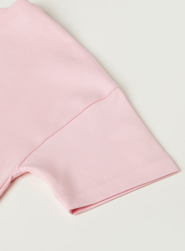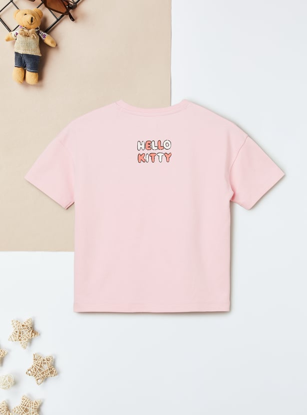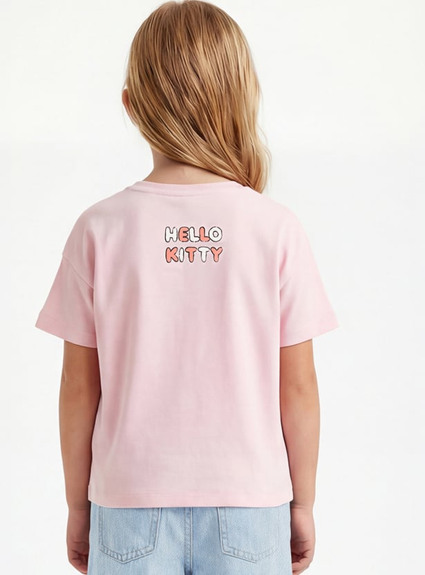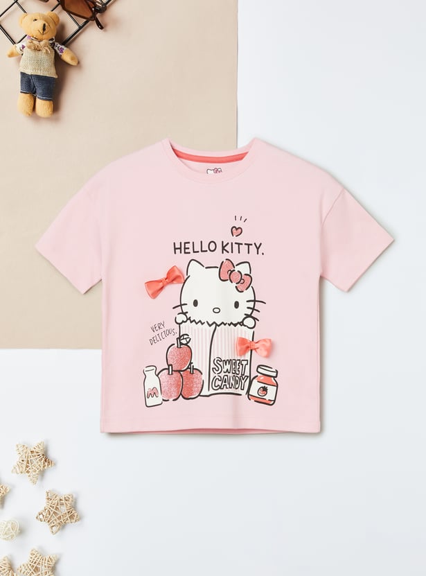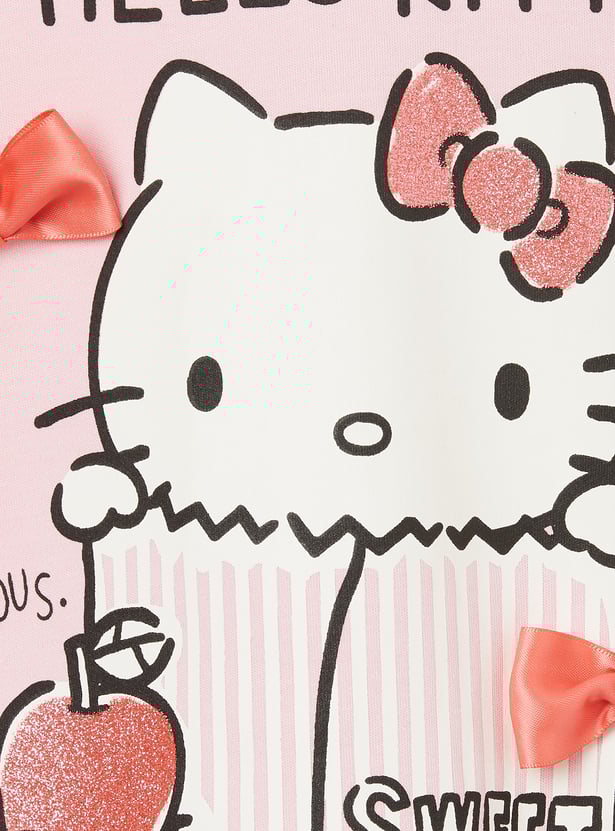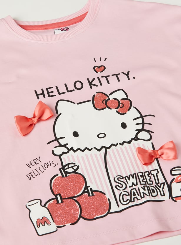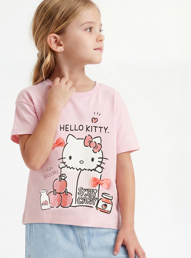 Brighten up your kid’s wardrobe with this playful Hello Kitty print T-shirt, featuring a round neckline, bow applique, and half sleeves for everyday comfort and cheerful style.