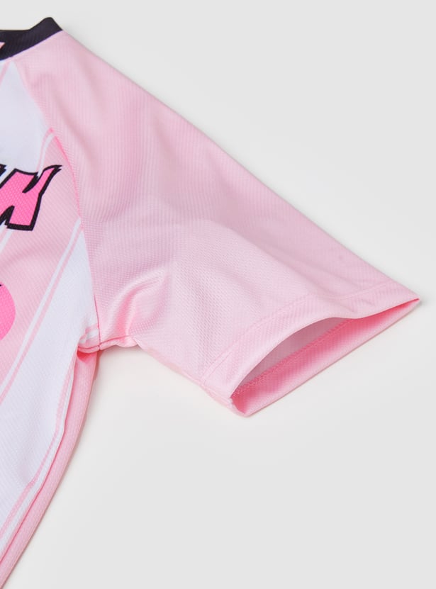 Fun and casual, this Hello Kitty colourblock t-shirt is styled with a flattering V-neck and half sleeves. The playful stripes combined with the iconic Hello Kitty design make it a cheerful everyday piece that blends comfort with character.