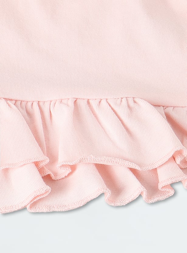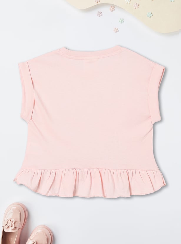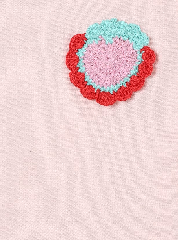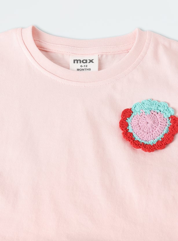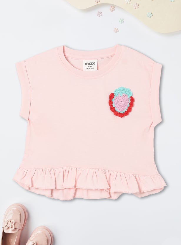 This knit embroidered top features beautiful placement knit detailing for a unique touch. The round neck and extended half sleeves offer a comfortable, stylish fit, while the ruffle hem adds a playful, feminine flair.