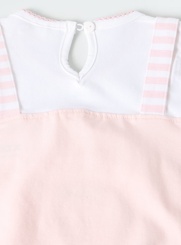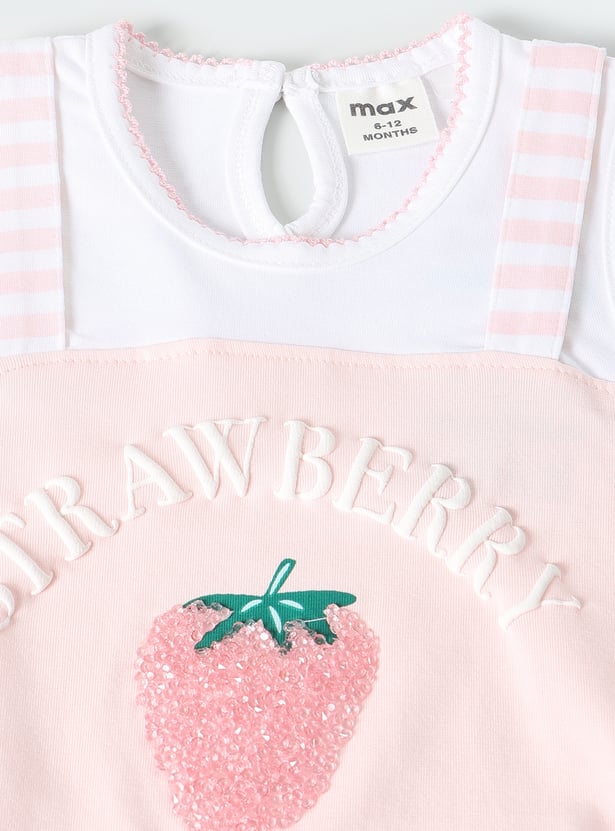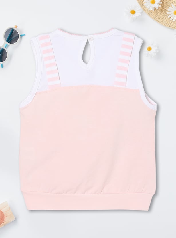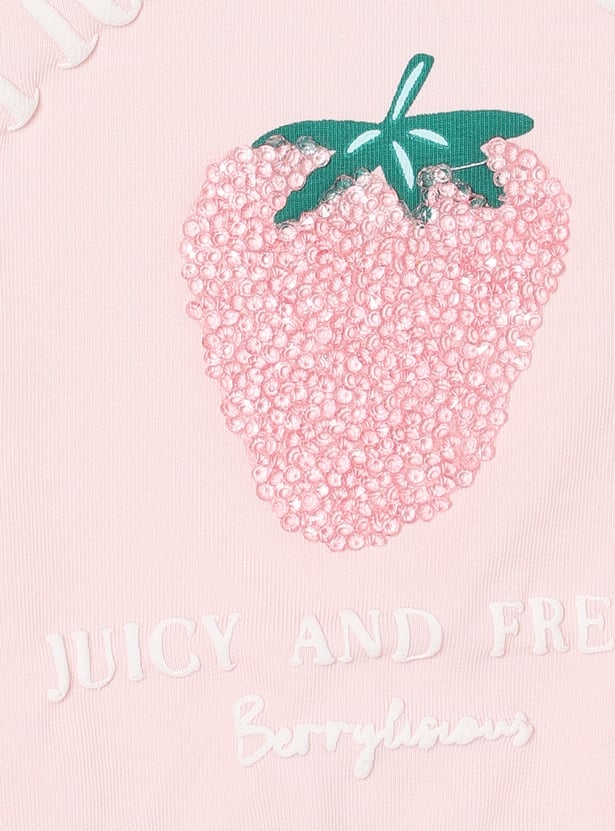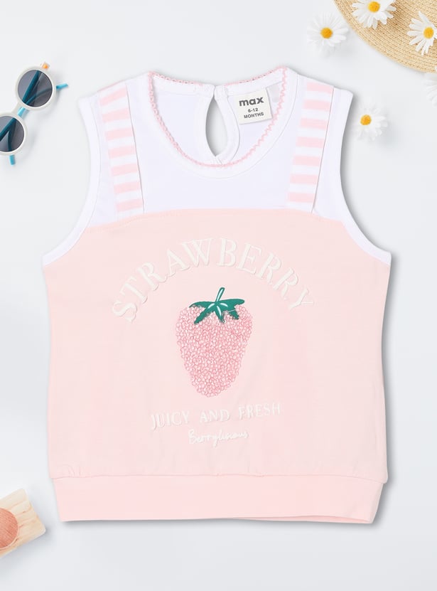 This adorable knit top features a round neck, sleeveless design, and a button closure. The cute strawberry knit on the front adds a fun and playful touch, making it a perfect choice for warm-weather styling.