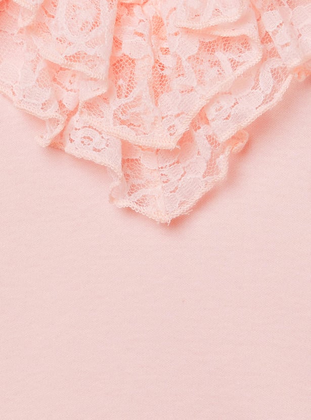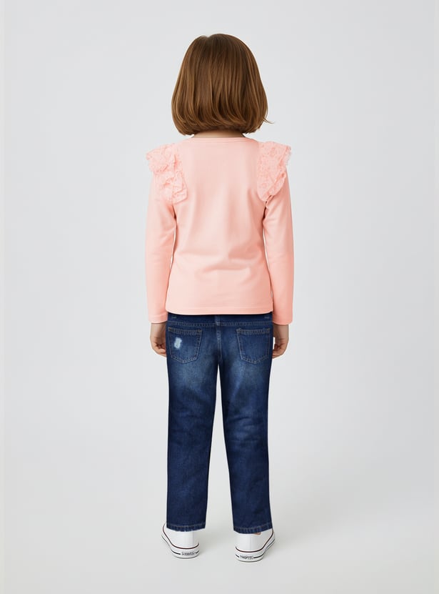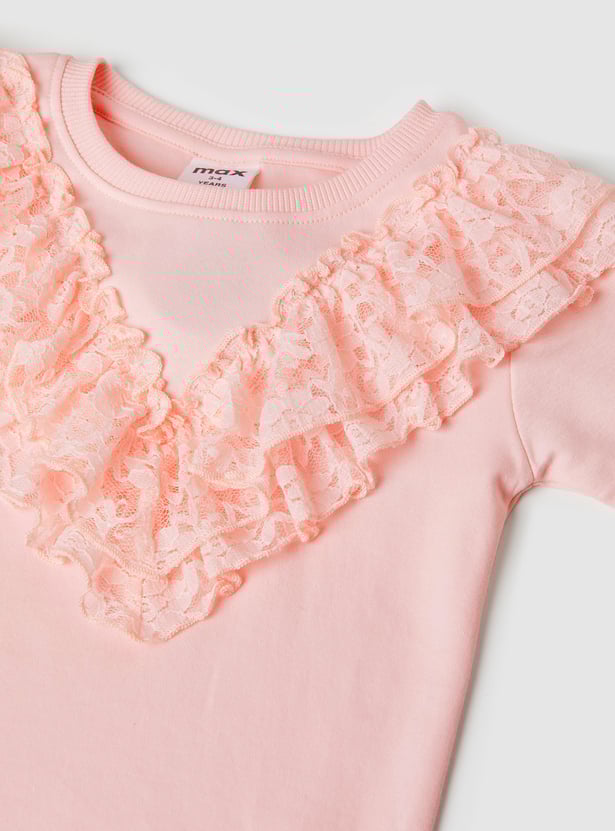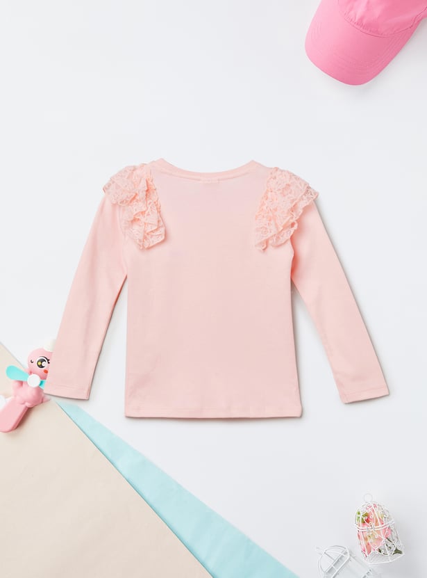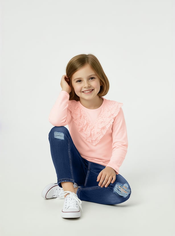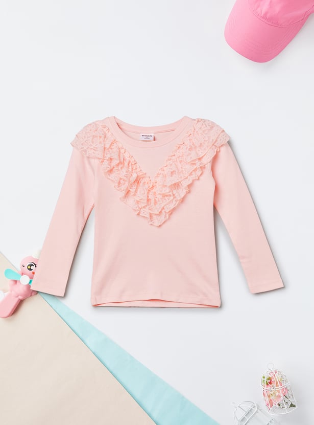Delicate charm meets everyday comfort in this lace frill t-shirt. Designed with a soft, round neckline and cosy full sleeves, this tee features elegant lace frill detailing that adds a touch of sophistication to her casual wardrobe.