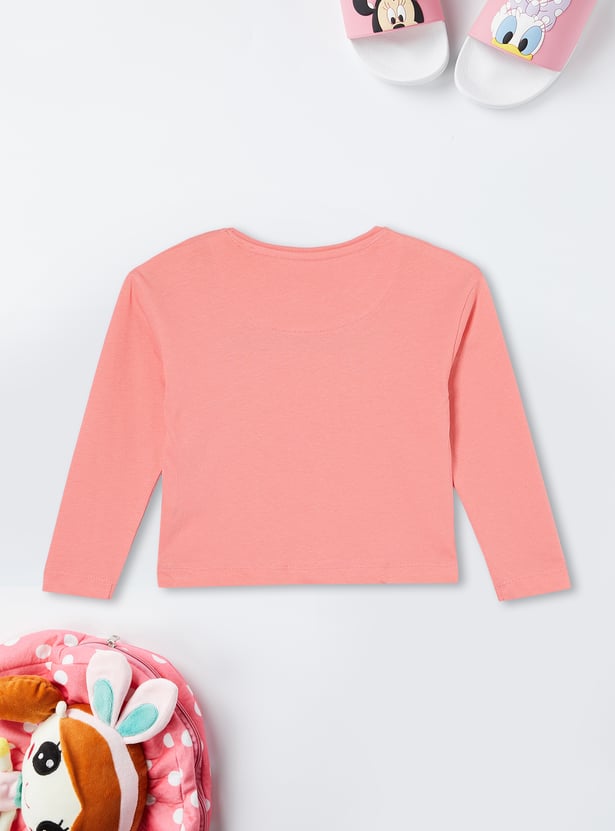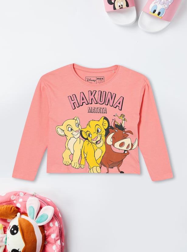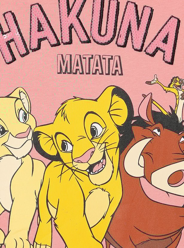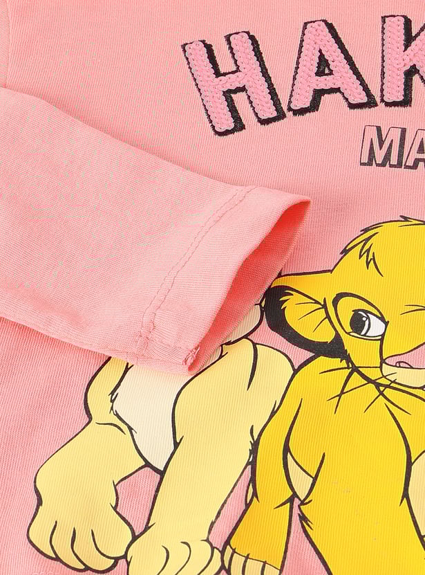 Elevate your little one's wardrobe with this adorable T-shirt. Featuring a vibrant Lion King print adorned with sequins, it adds a touch of sparkle to her everyday outfits. The round neck and full sleeves ensure a comfortable fit, making it perfect for all-day wear.