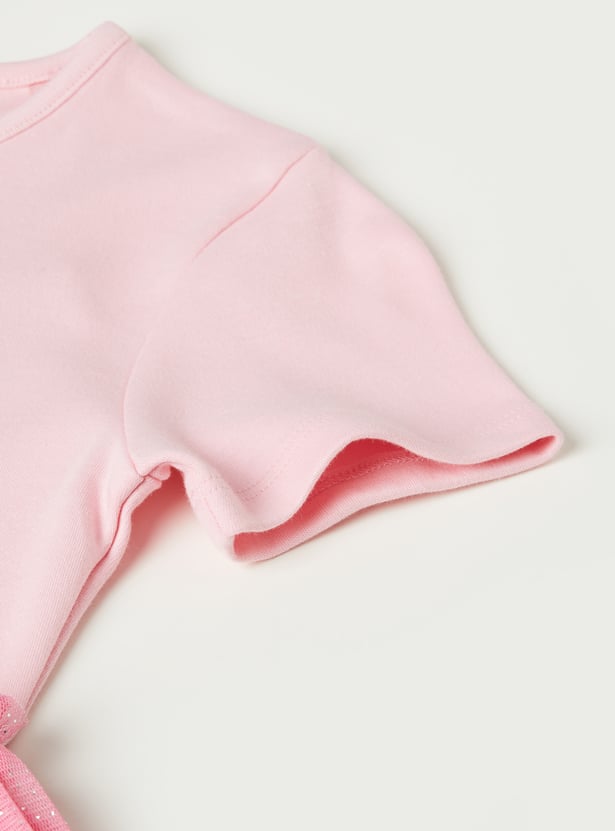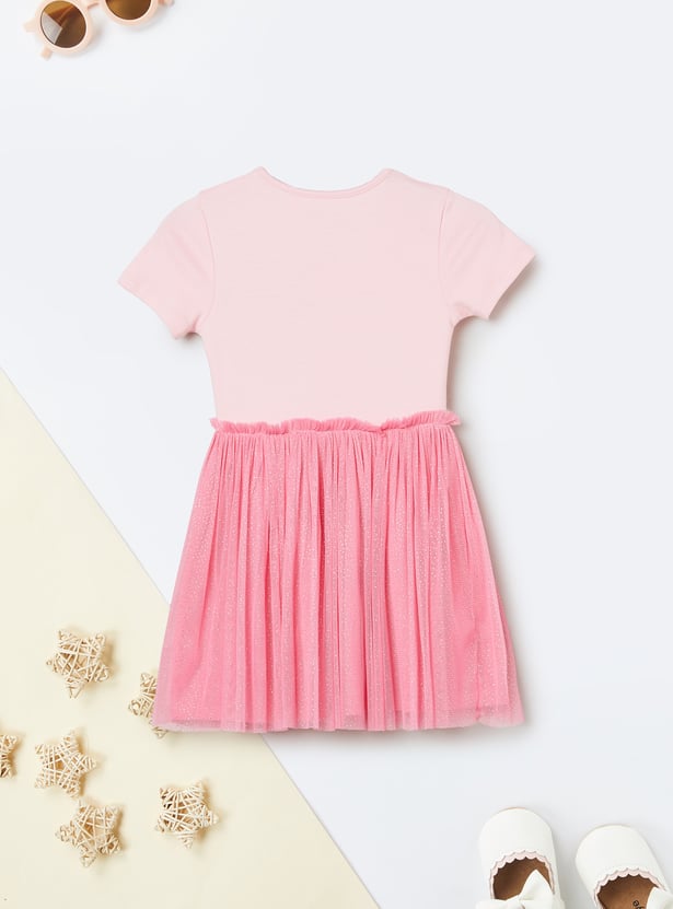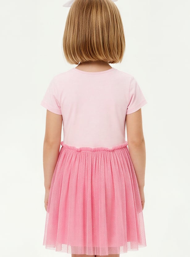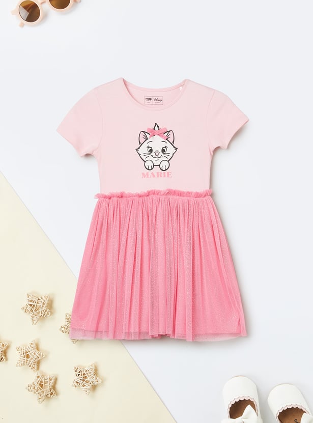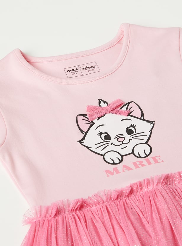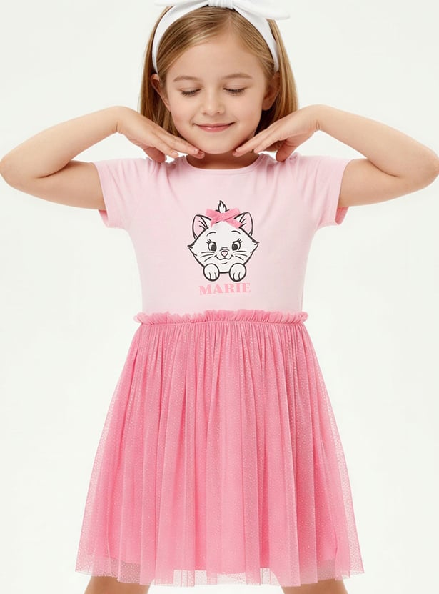 Add a touch of charm to her wardrobe with this adorable tulle dress featuring a playful Marie print. Designed with a round neckline and half sleeves, it blends everyday comfort with sweet character style. Crafted from soft, breathable fabric, it’s perfect for casual outings, playdates, or warm-weather days.