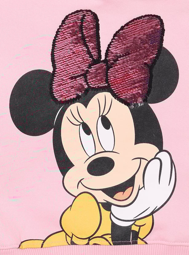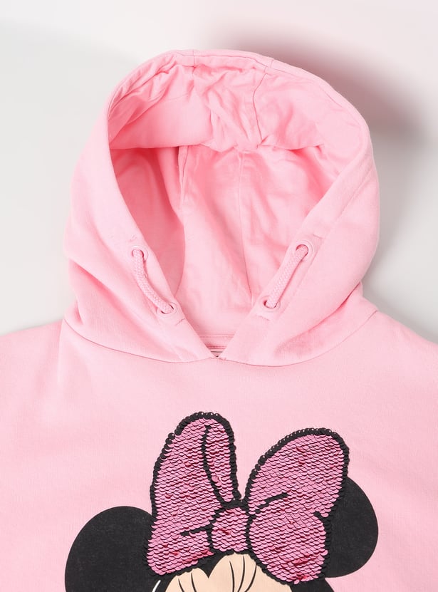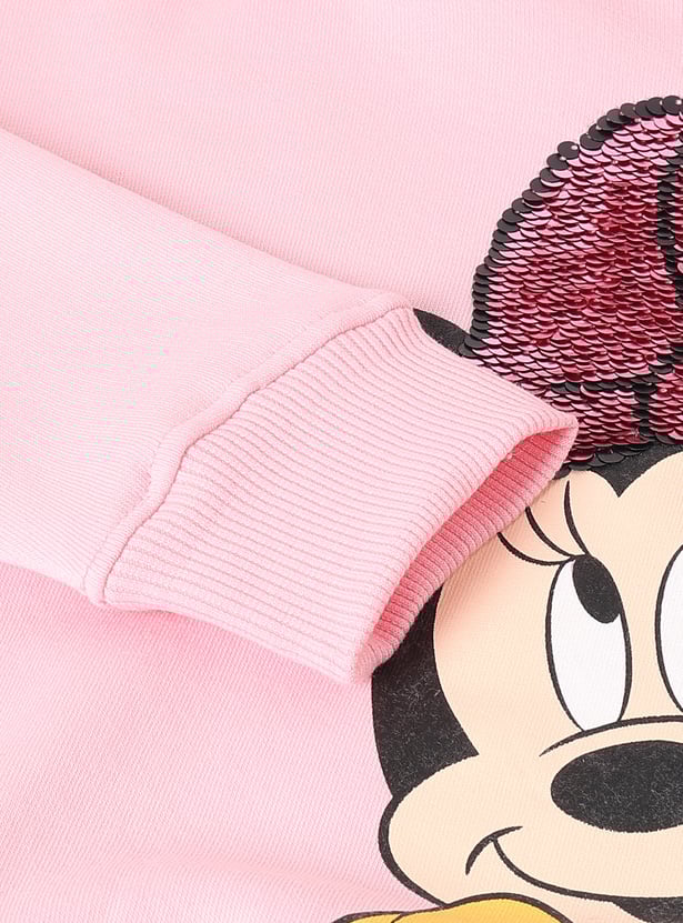 This girls’ Minnie Mouse sweatshirt features charming sequin detailing that adds a playful sparkle to her outfit. Designed with a hood, full sleeves, and ribbed hems, it offers comfort with a touch of Disney magic.