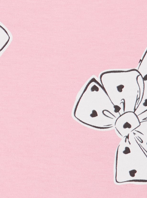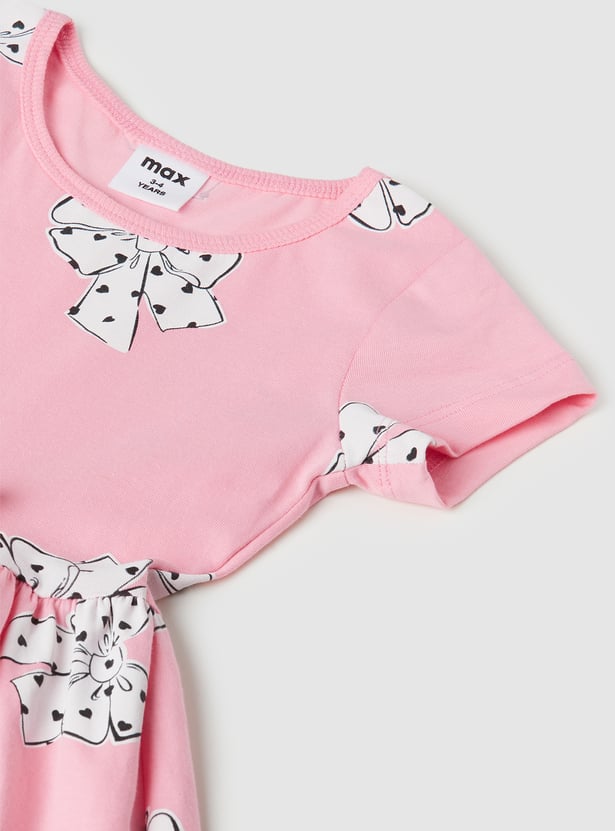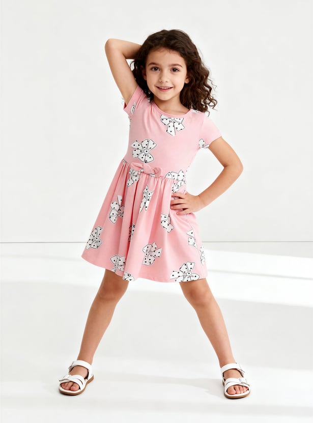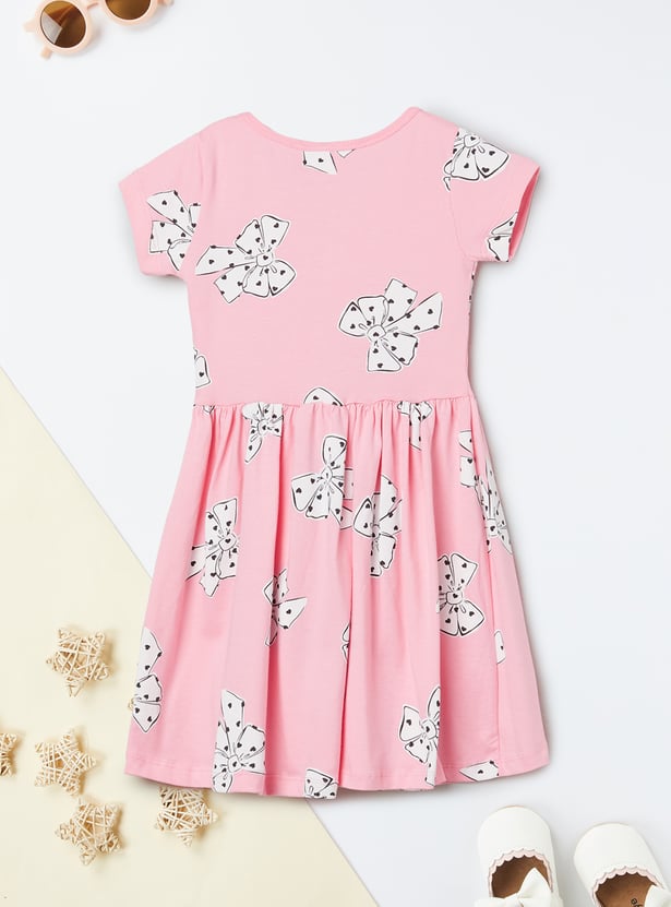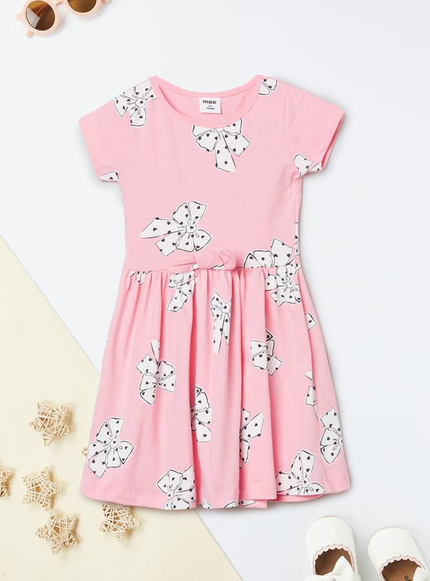 Bring a playful touch to your wardrobe with this printed dress, featuring a round neck, half sleeves, and a charming bow applique detail.