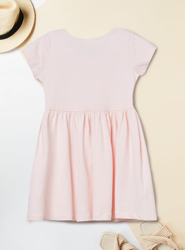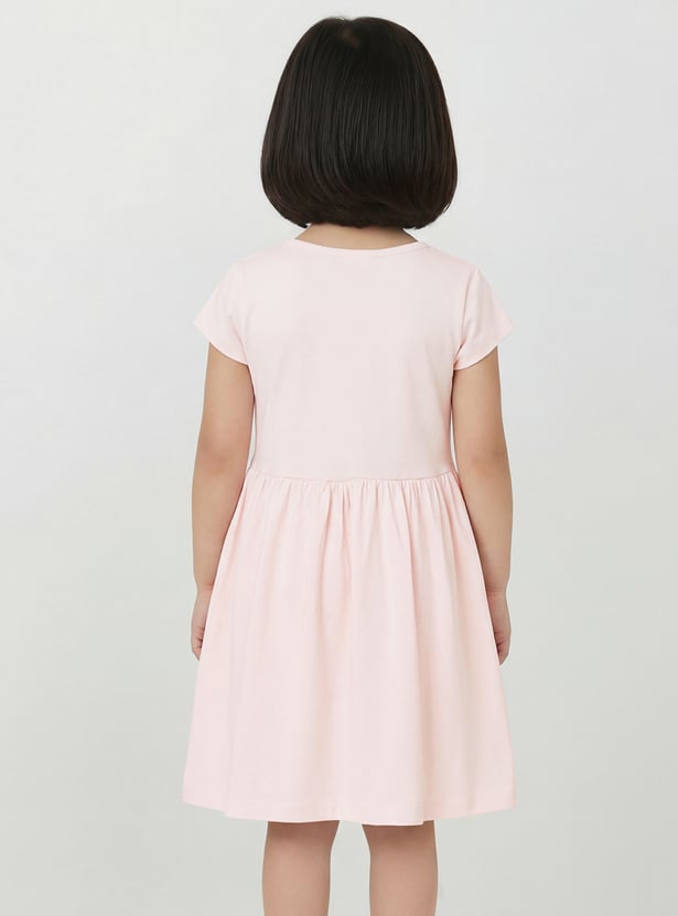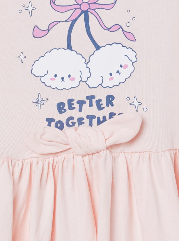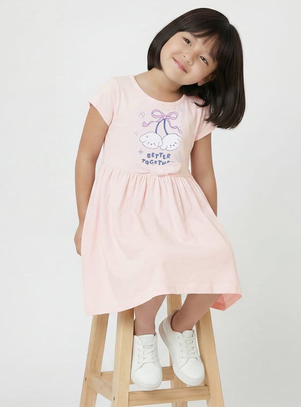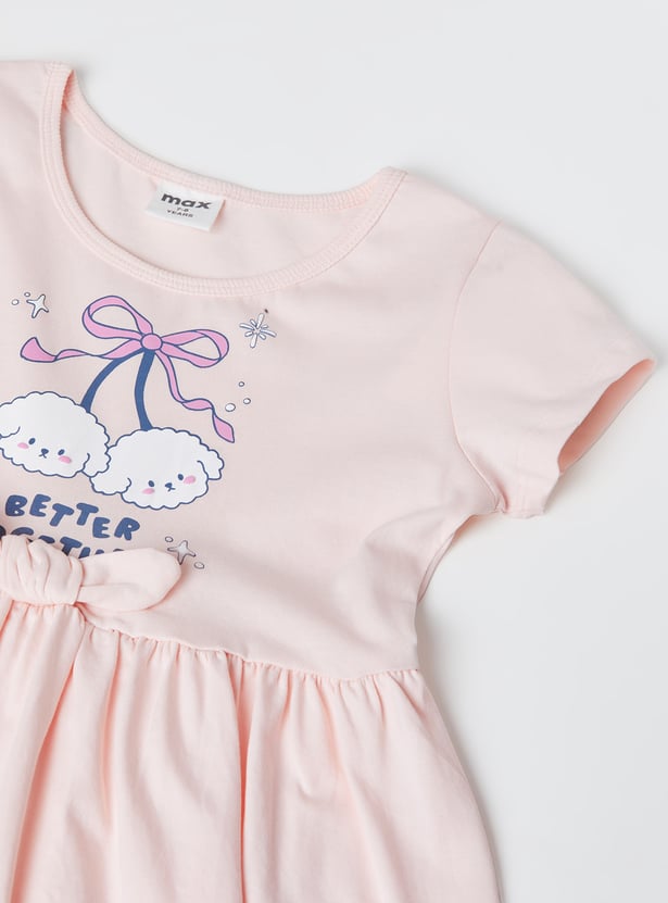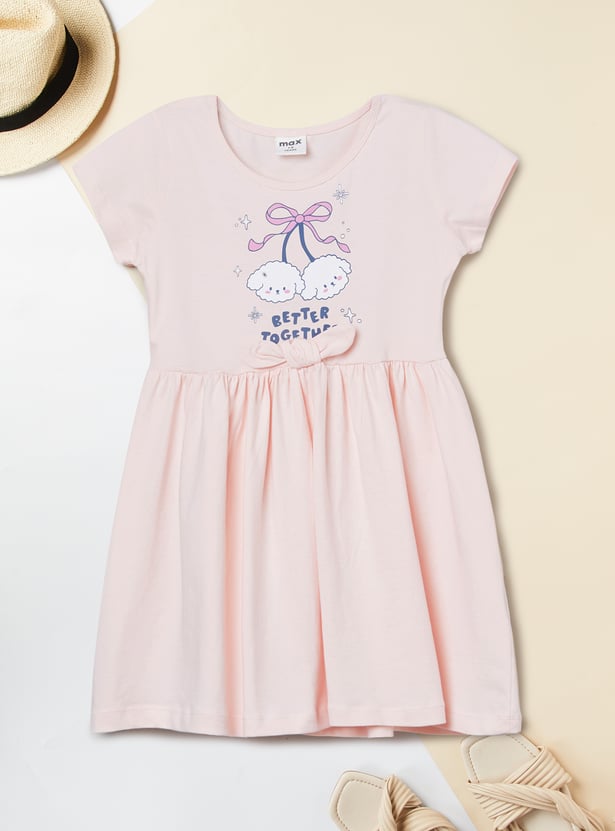 Bring charm and elegance to her wardrobe with this girls’ printed dress. Featuring a round neck and half sleeves for comfort, it’s beautifully finished with a bow at the waist that adds a sweet, playful touch.