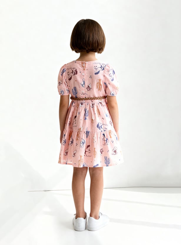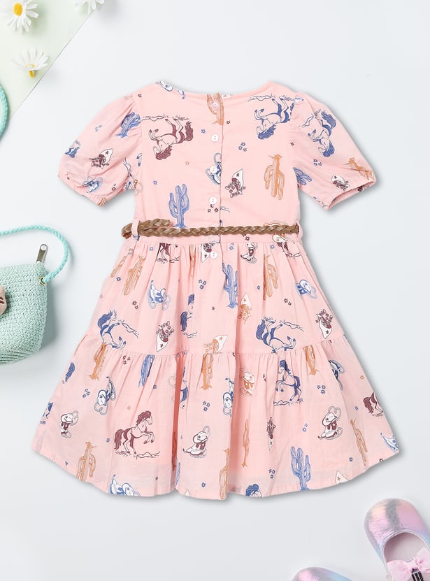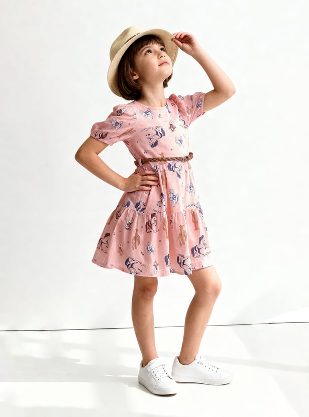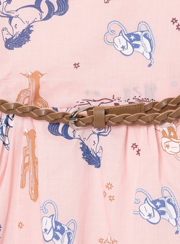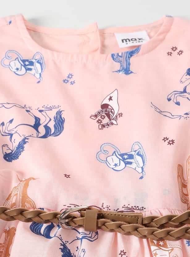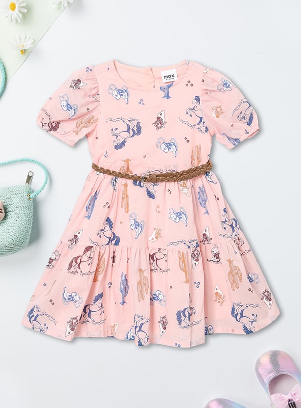 Printed dress featuring a round neck and half sleeves. Designed with a button closure and comes with a matching belt for a defined waistline.