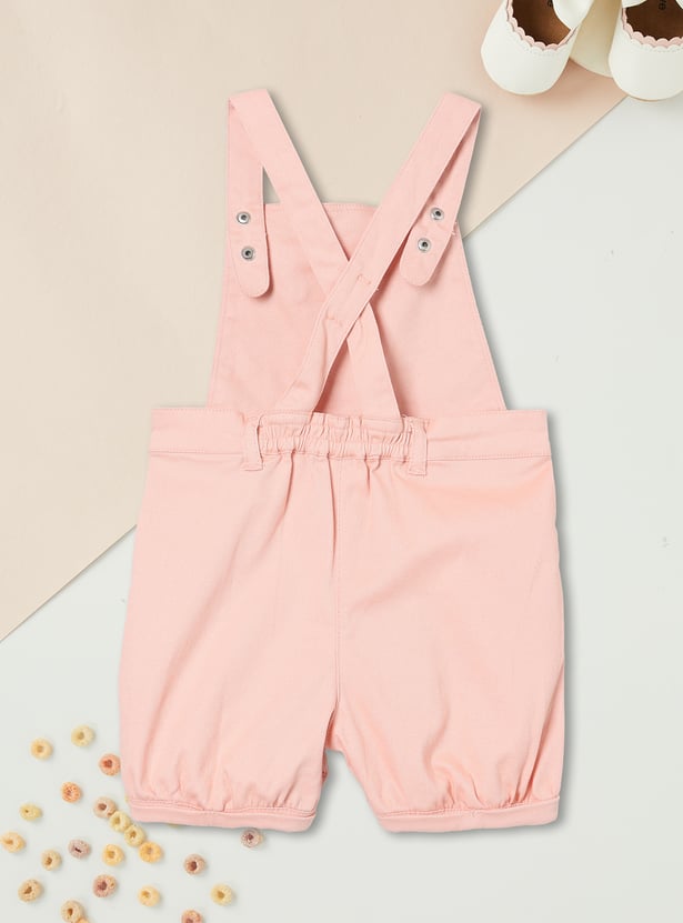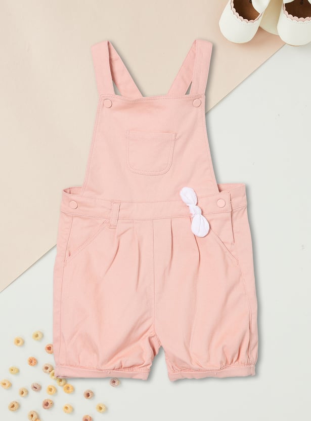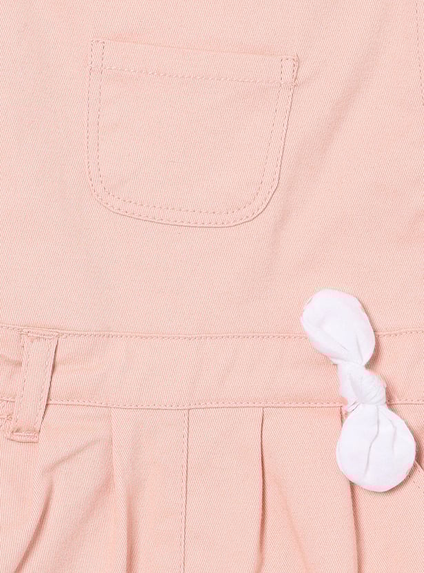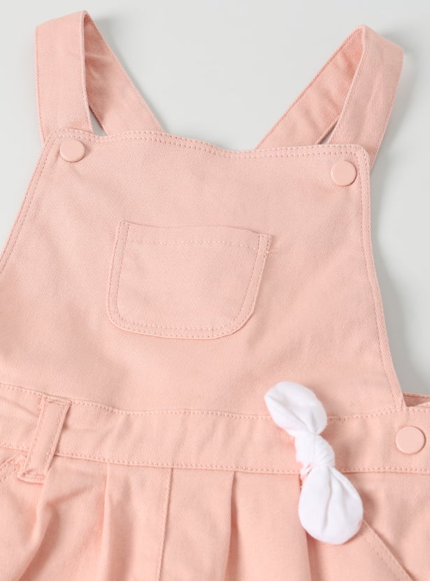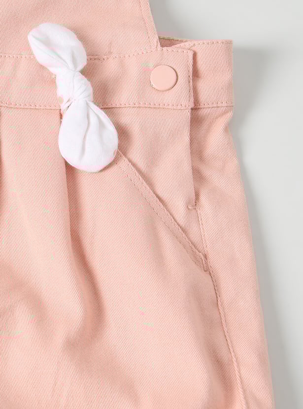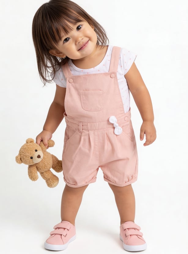 This girls’ solid dungaree set comes with a printed round-neck T-shirt for a coordinated, playful look. The knee-length dungaree features adorable bow detailing at the waist, adding a charming touch to her casual style.