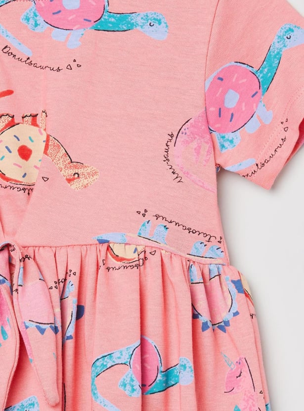 An ideal pick for your little one, this A-line dress is designed with a printed surface, round neckline, and short sleeves.