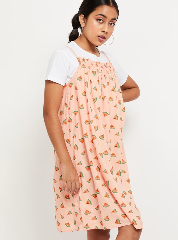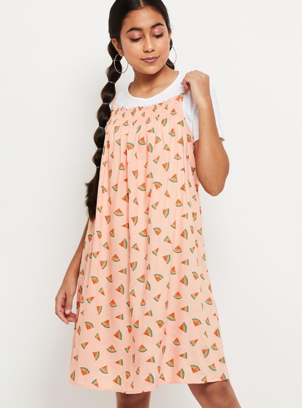 Make a style quotient with this A-line dress designed with a printed surface, round neckline, and sleeveless silhouette. This dress comes along with a solid t-shirt.